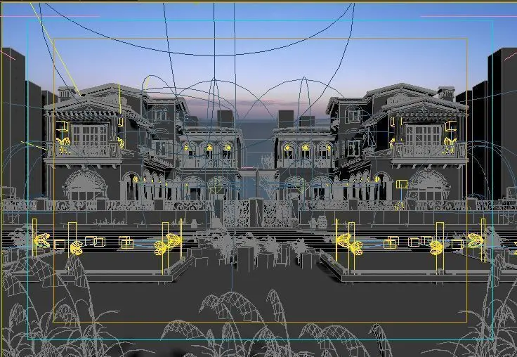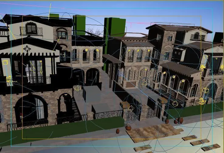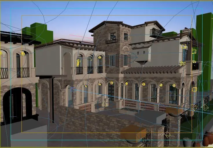 This fully textured exterior scene includes trees, grass, furniture.