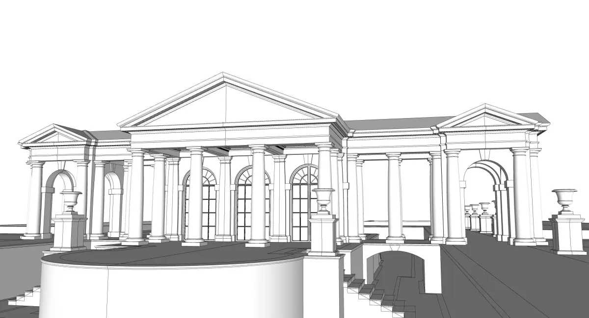 The gazebo structure rests on Tuscan columns with carefully modeled pedestals and a complete entablature. Each column is constructed according to the modular system of classical architecture, incorporating proper entasis to reflect authentic craftsmanship. The minimalist elegance of the Tuscan Order makes this design both timeless and versatile, suitable for luxury residential, hospitality, or public space concepts.