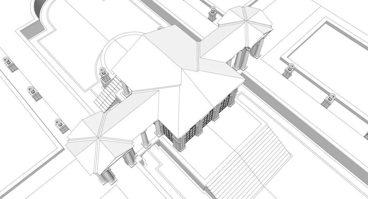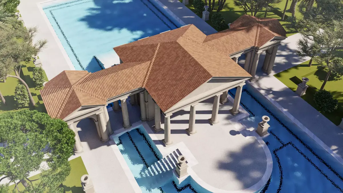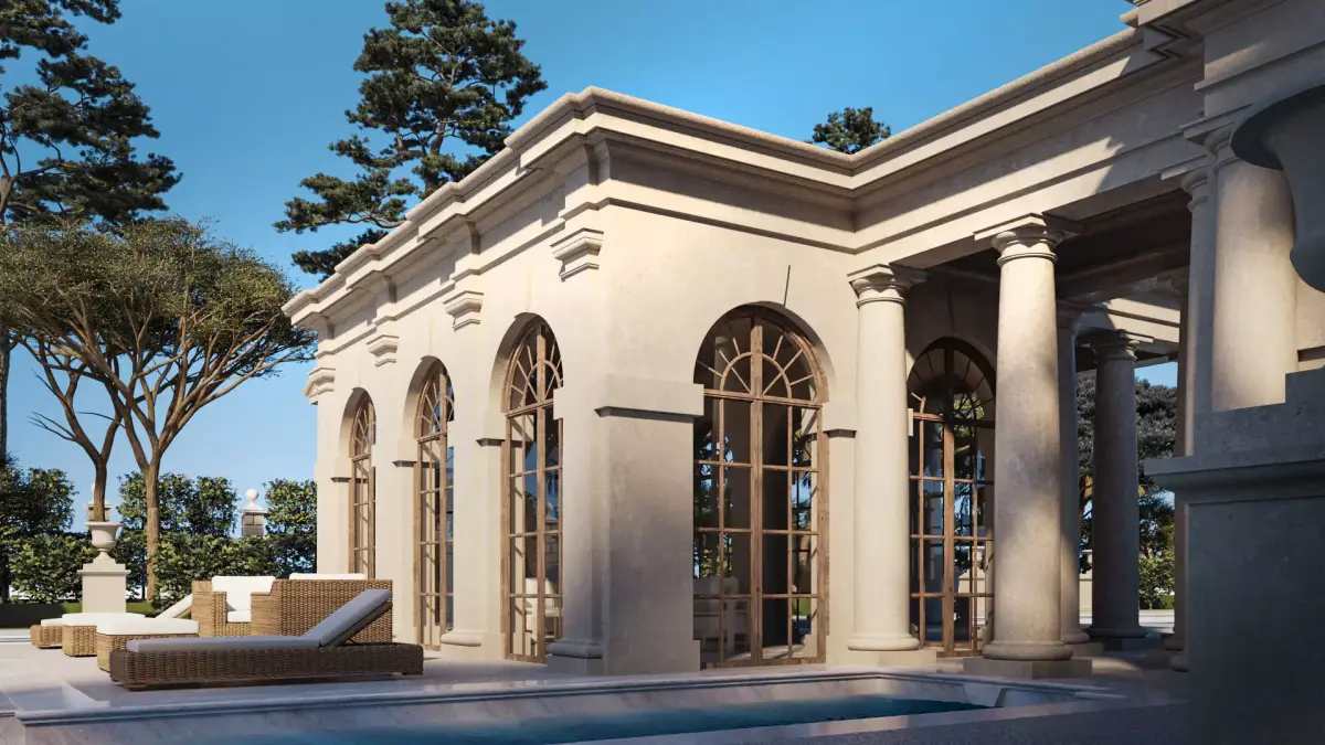 The backyard setting has been designed to create a harmonious outdoor retreat, combining the refreshing presence of the pool with the dignified beauty of classical architecture. The composition can be integrated into villa landscapes, resort areas, or architectural visualizations that require a touch of sophistication and tradition.