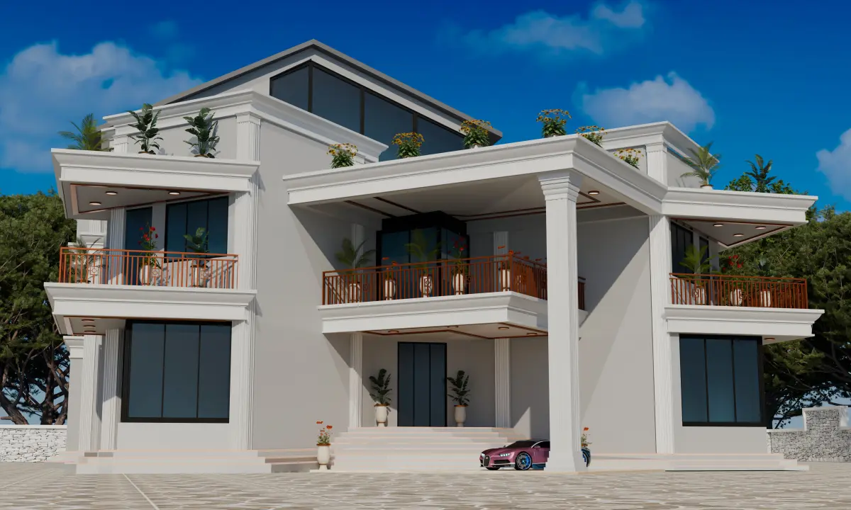This is a 2 story exterior model. Marble tiles are in this model. High quality materials used at this model. There are two living roomon ground floor. There are beautiful passage at floor. balcony's are covered by metal pipe etc