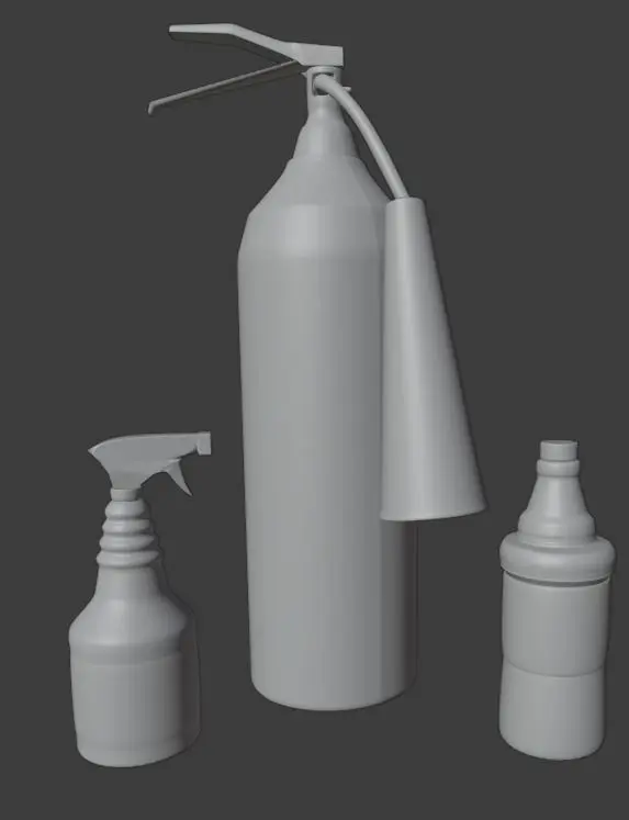 Extinguisher, Spray and bottle Uv organized, no textures included. Perfect for texture artist who want to practice and if you want to compose your scene. Able to use high quality textures.