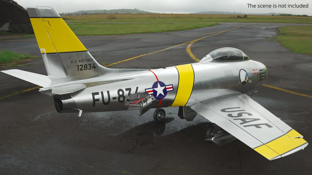 F-86 Sabre Cold War Fighter Aircraft Silver with Interior Rigged is a three-dimensional model of the iconic American jet fighter from the early Cold War era.