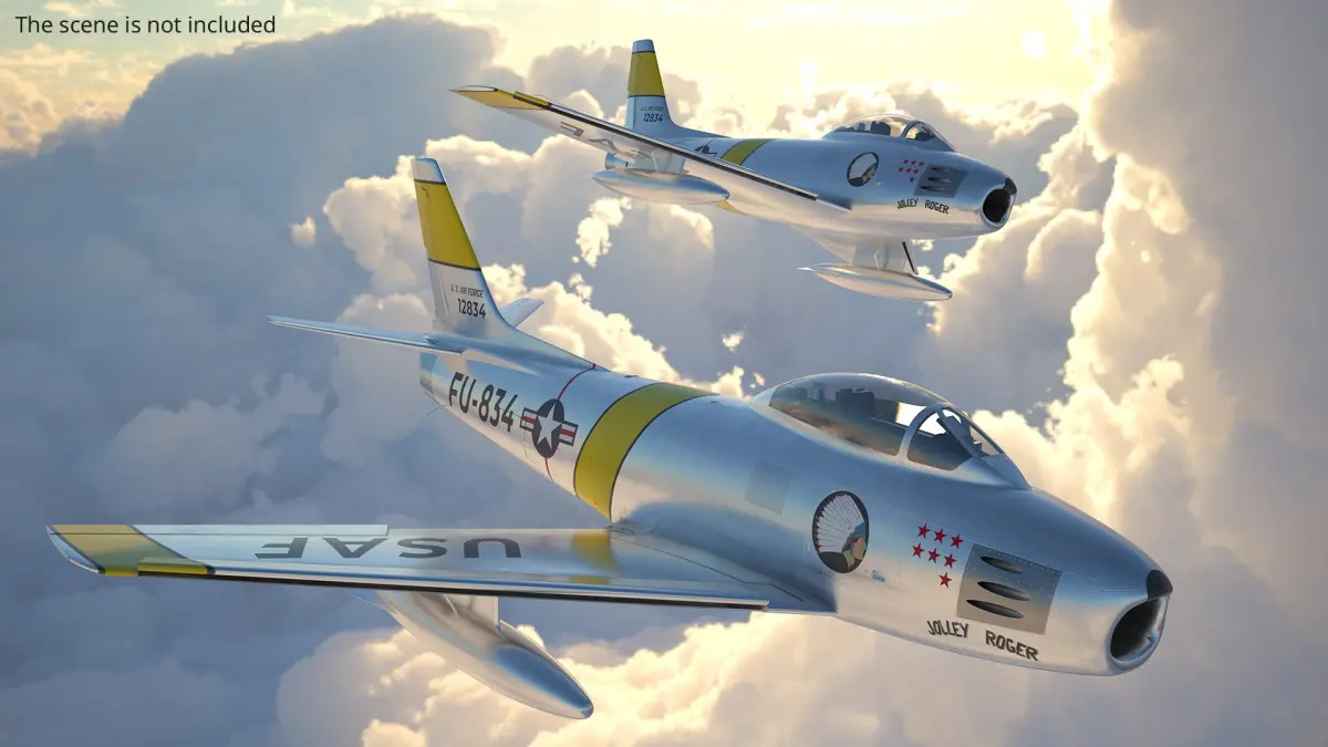 F-86 Sabre Cold War Fighter Aircraft Silver with Interior Rigged for Maya is a three-dimensional model of the iconic American jet fighter from the early Cold War era.