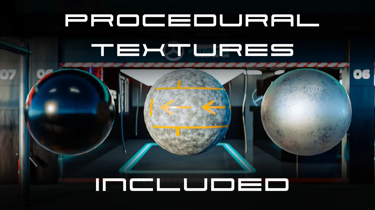 Pre-built F1 garage scene made from procedural materials and allows customizable lighting setup.