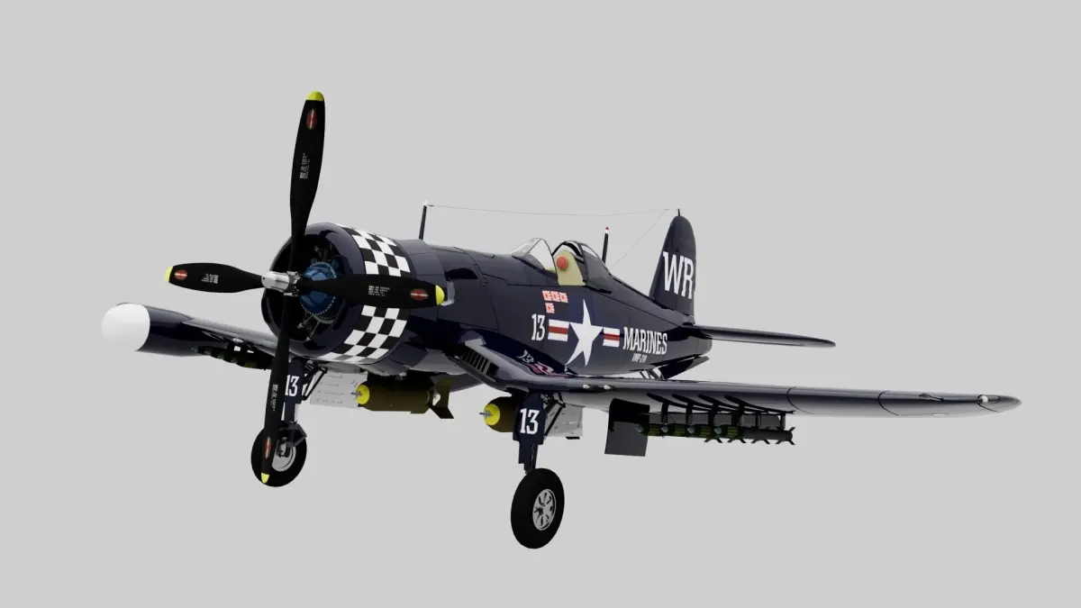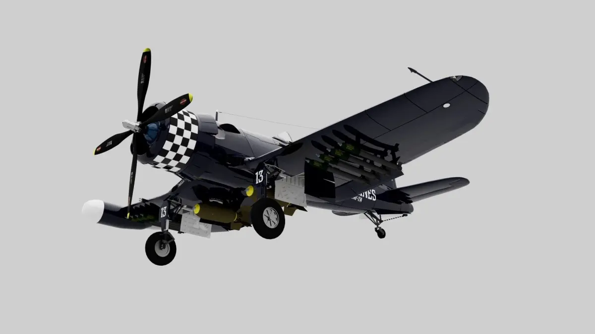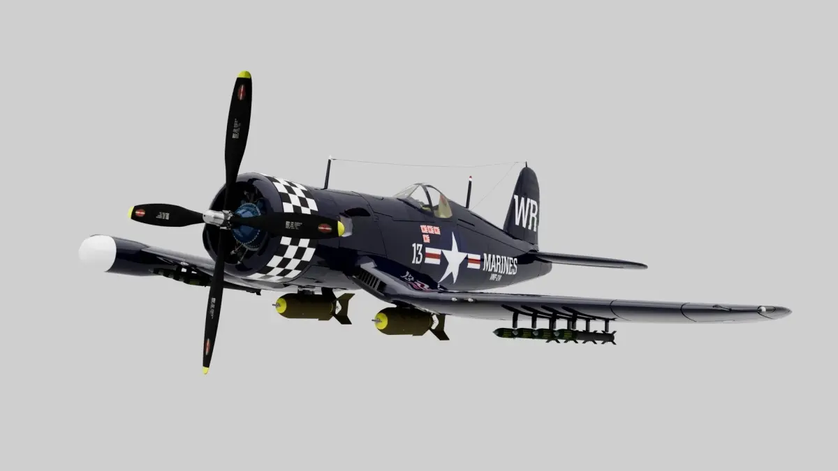 This is a model post WW2 model of the F4U Corsair. It includes 2 500lbs bombs and 8 FFAR rockets. The FFAR's have a Bifrost smoke emitter. The models landing gear, flaps, cowl flaps, canopy and wing-fold are rigged. (The 500lbs bomb and FFAR rocket can be purchased separetly.) The 20mm cannons have shellcasing and bullet emitters wich can be turned on and off in the Maya channel box. Model is UV unwrapped and includes the complete Photoshop file with all separate layers.The videos are an example of what can be done with this model. Enjoy!
