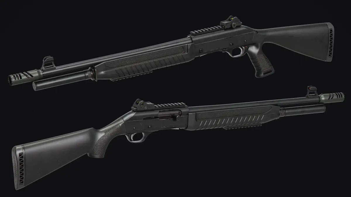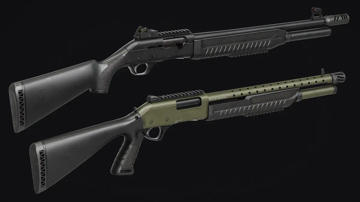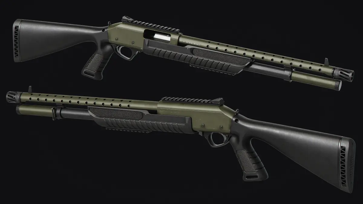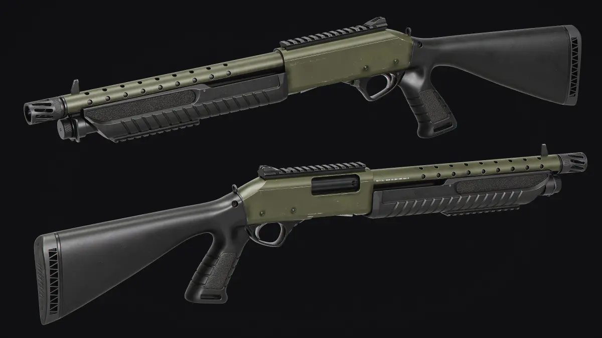 - Pump action shotgun comes with short, larger barrel and both in black and green coat textures.