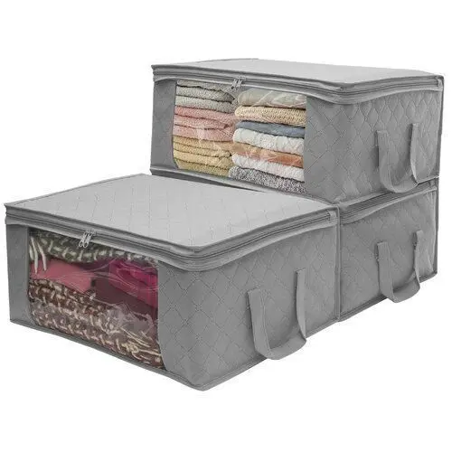- Pack, zip and transport household essentials with a clear view! This Fabric Underbed Storage store and protect your seasonal items and apparel. It features two carry handles and a large transparent front window to see contents at a glance. The generous size compartment provides plenty of room for clothing storage, blankets, linens, holiday decorations, toys, photos, baby clothes or to use as sari bags. A fully zippered closure protects from dust, pest and water damage while securing Don't let limited closet space cramp your style! Store out-of-season or infrequently used items with ease. Make the most of your wardrobe with folded garments that neatly fit into soft storage bags. Whether you're storing sweaters, guestroom linens, or your favorite designer bags, these organizers are perfect for the closet, bedroom, laundry room or attic. Once filled, they easily fit on shelves, stack on top of each other or slide under the bed to maximize space. For an added scent, place some fragrant sachets inside before zipping them close! Traveling or moving? Easy-carry handles make these bags portable and convenient for transporting to new locations. Easily view contents through transparent side windows while packing the car for a long trip or unloading the U-Haul for a seamless move. Breathable fabric protects against dust and pests while allowing airflow to keep items fresh. Durable and compact for space-saving storage. Made of Polypropylene Non-woven. Includes one large section with large transparent window, zipper closure and 2 handles.