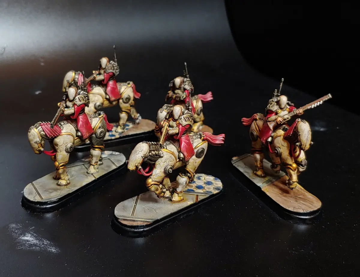 This is a multipart kit made to build a squad for Fabricarii Hussar cavalry. The kit comes with 10 bodies, 10 basetoppers, heads, and arms for rifles as well as melee weapons and pistols.Arms are cross compatible with the Fabricarii - Testudo Squad. The head socket is cross compatible with other Fabricarii, Cyberzerker and Jade Coalition troops, so feel free to mix and match.
