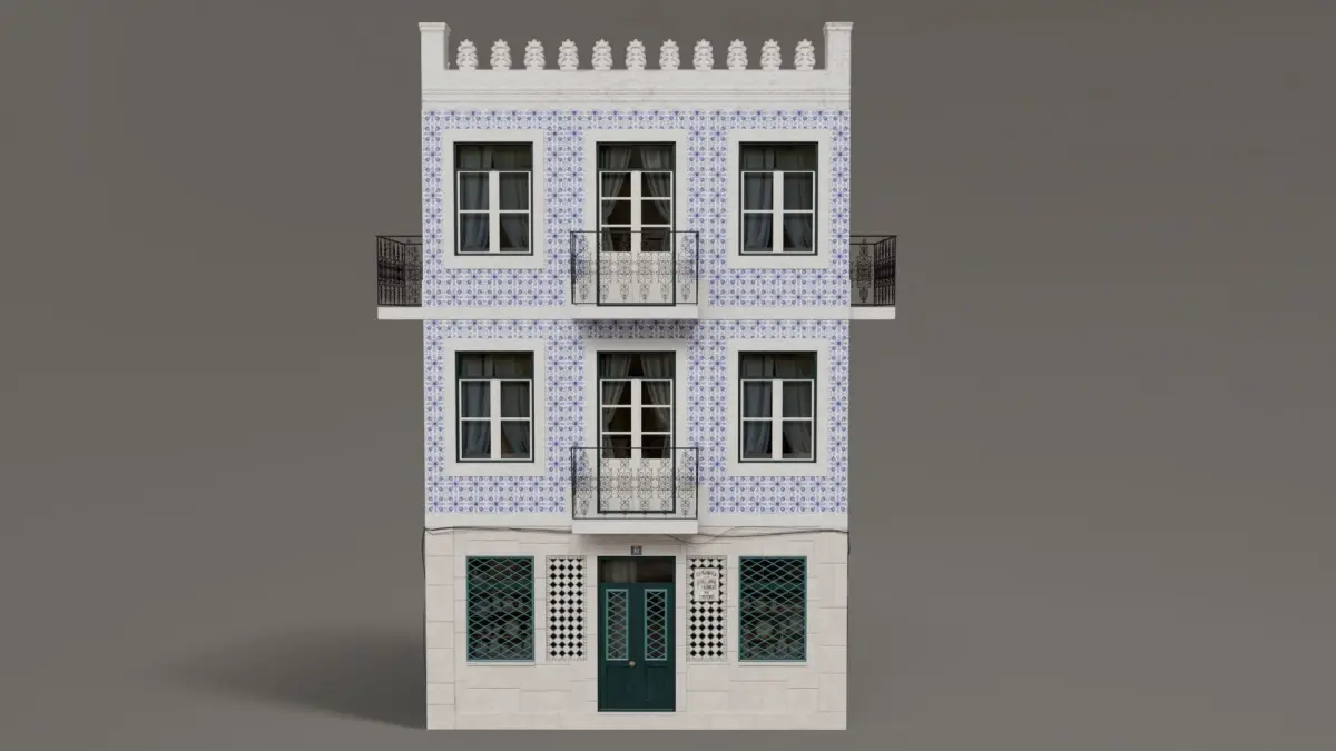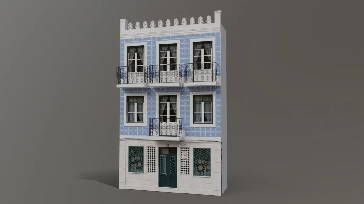 The facade of a Portuguese building, created based on references. The model has a modular structure, allowing you to assemble several different models like a construction set. You can vary the number of floors, balconies, and the design of the side walls. Behind the windows, there is a backing to simulate an interior, and this texture can easily be replaced in Photoshop or adjusted/removed in any 3D software.