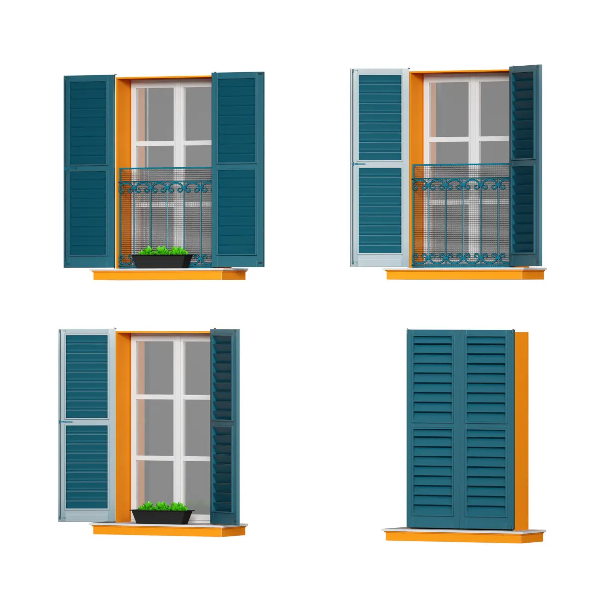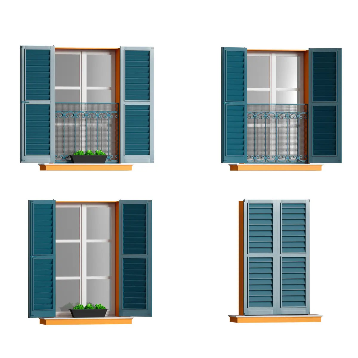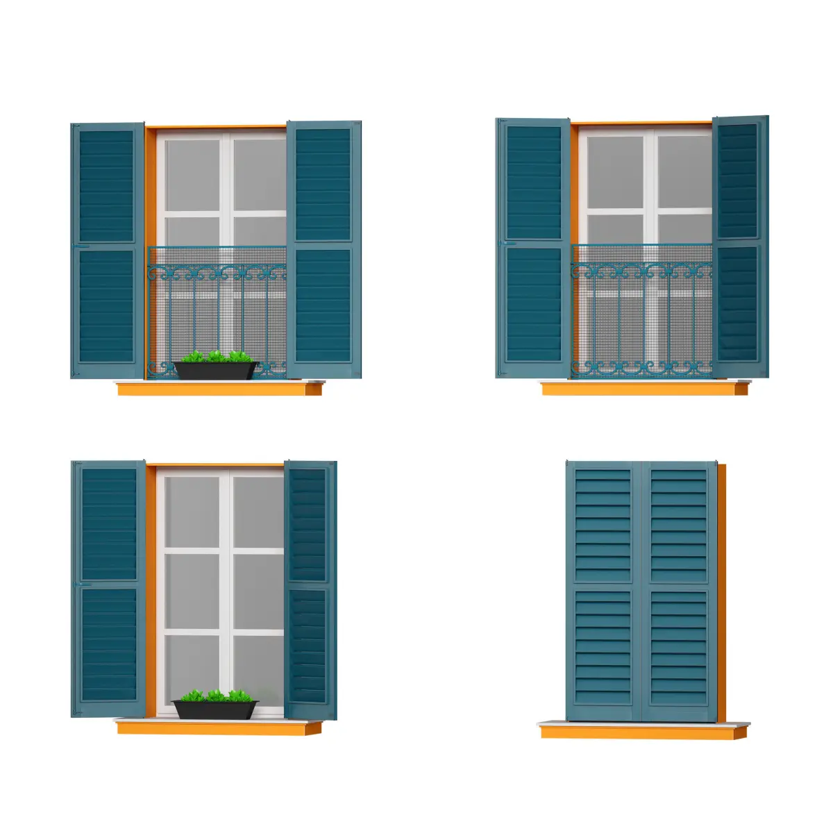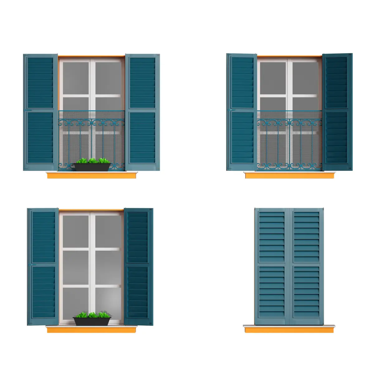 3D model of a window for the facade of a building with louvered shutters. The details also include a metal window grille and a box with plants on the windowsill. The model presents four window options: with open shutters with a grille and plants, only with a grille, without a grille and with closed shutters. The window consists of glass, a frame, a window opening with a sill, two louvered shutters, a grille and a box with plants. If necessary, you can remove unnecessary elements or turn the shutter doors to the desired angle.