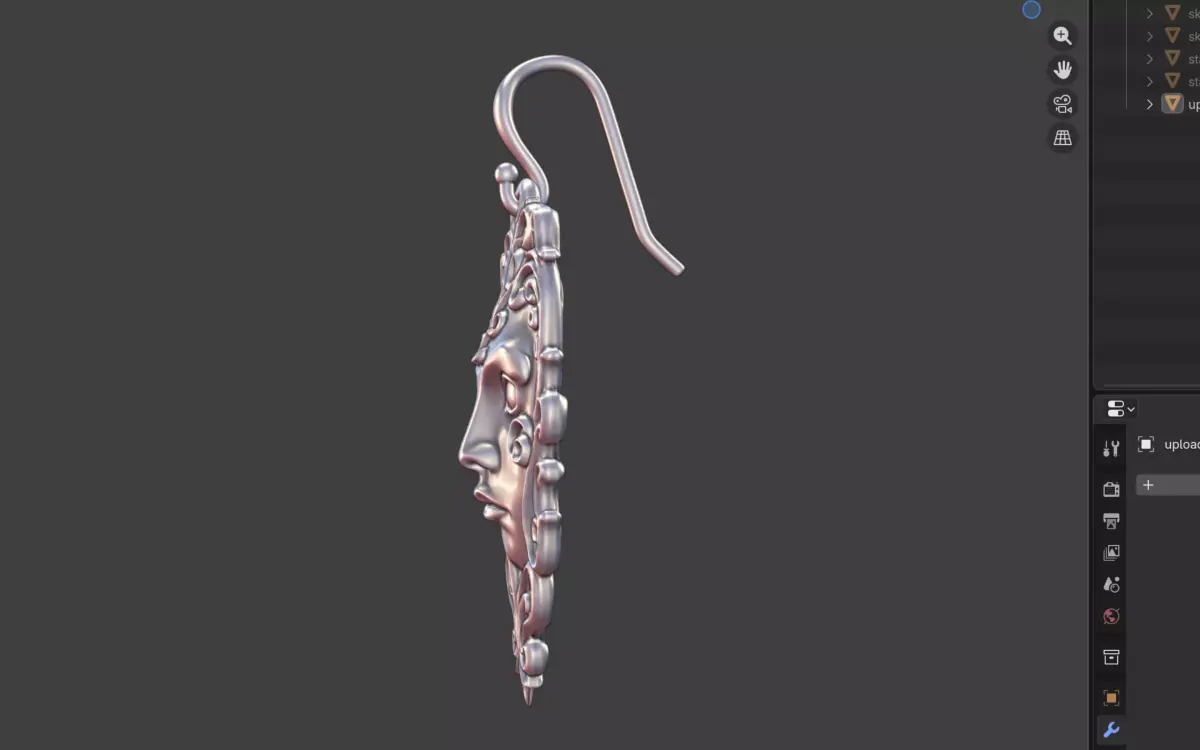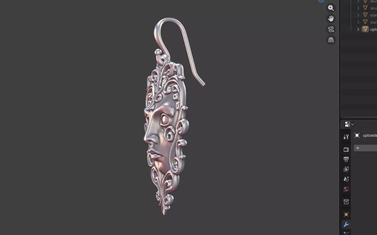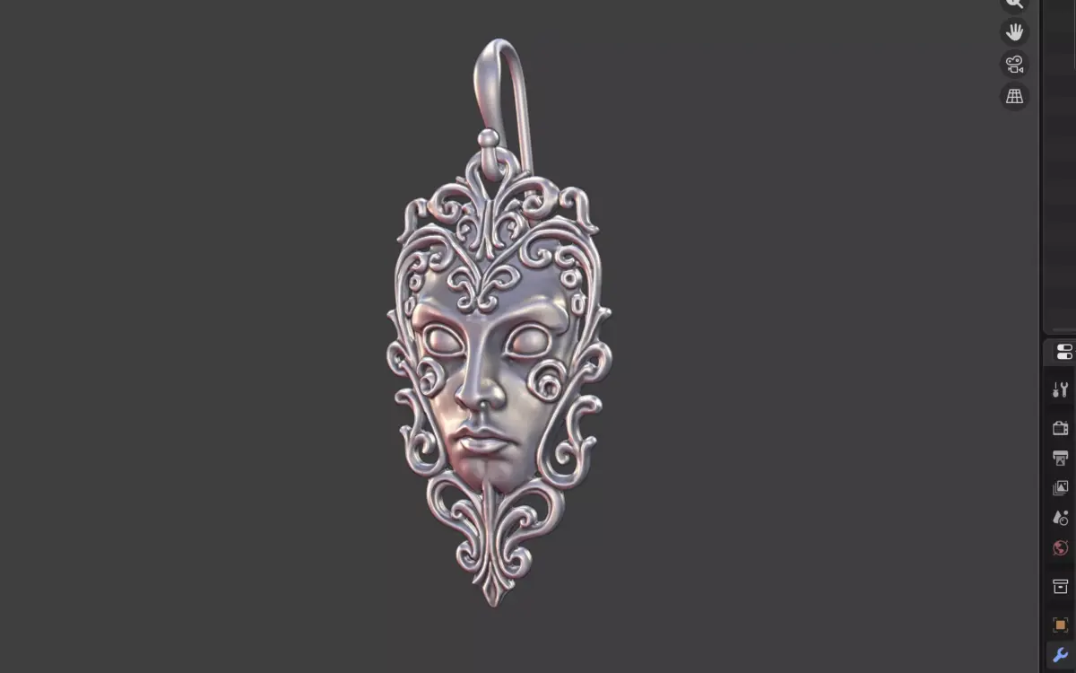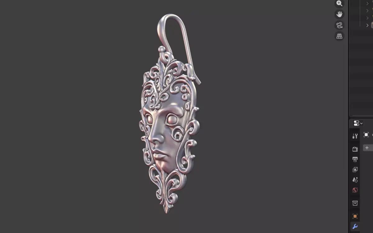This compact and elegant piece functions as either a pendant or an earring, featuring a stylized face framed by delicate scrollwork. The flowing ornamental patterns enhance the character of the face, creating a visually striking balance of artistry and decorative detail. The fine sculpting ensures clarity and depth, making it a standout miniature accessory in any jewelry collection or digital render.