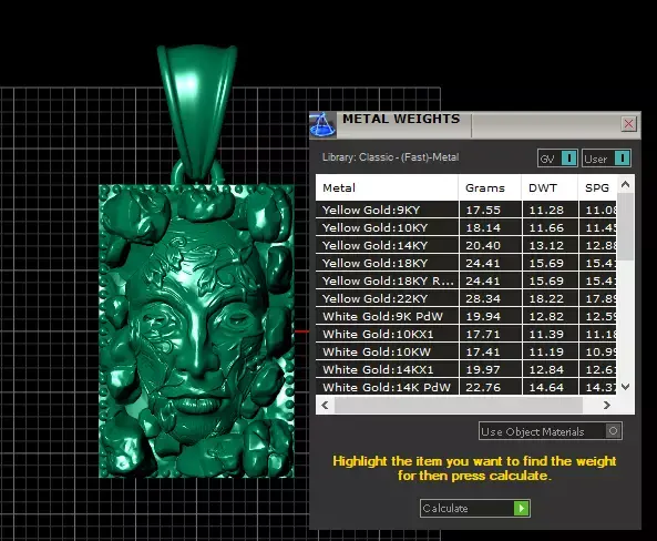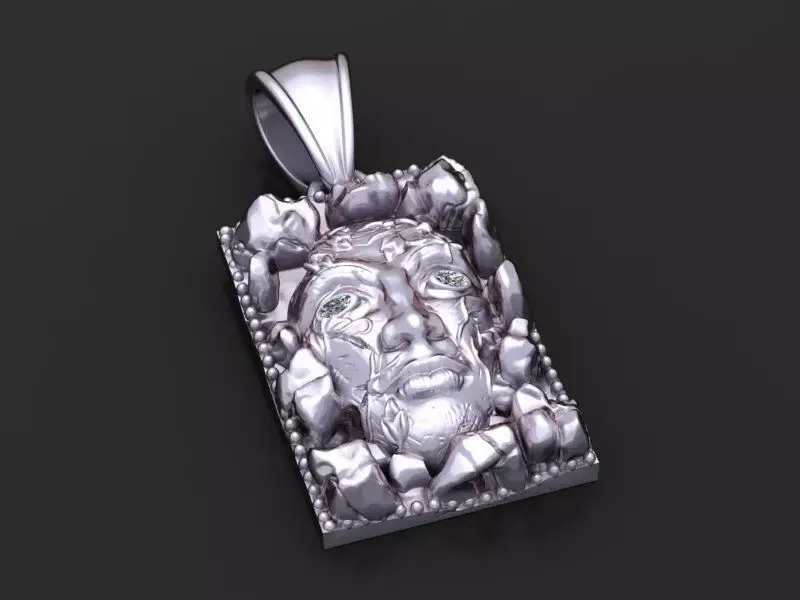 This striking 3D model features a bold rectangular gold pendant showcasing a dramatic sculpted face emerging from a textured, rock-like frame. The face is intricately detailed with lifelike expressions, flowing hair, and engraved vine patterns that add a touch of artistry. Two brilliant-cut diamonds are set in the eyes, giving the piece a captivating, almost mystical presence. The rugged outer frame contrasts beautifully with the polished facial features, creating a powerful statement piece that blends raw nature with refined craftsmanship.