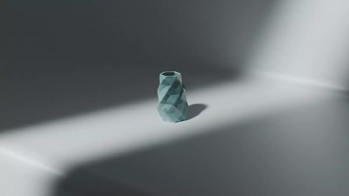 A stylish faceted modern vase featuring a geometric low-poly inspired surface with smooth, glossy ceramic finish. The soft aqua/teal color combined with subtle reflective highlights makes it perfect for contemporary interior renders, product visualization, architectural scenes, and decorative mockups.