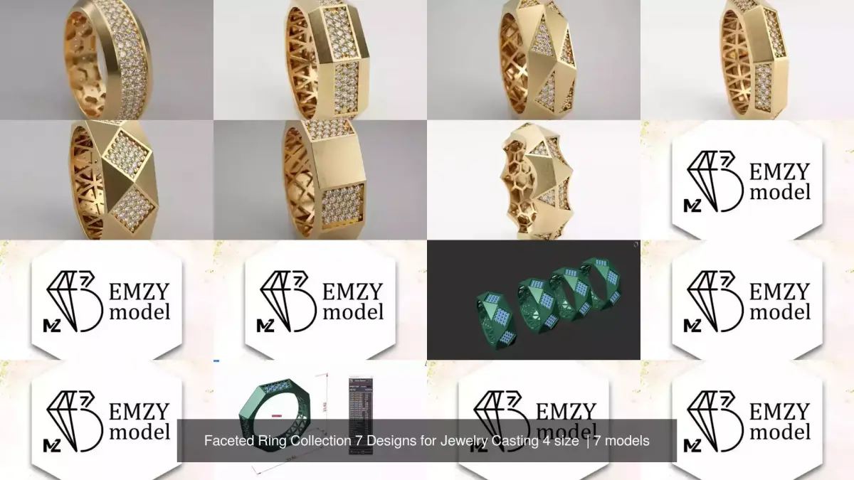 This jewelry collection includes 7 distinct ring models, each provided in 4 precisely scaled sizes. All models are prepared in hollow, production-ready versions with standard wall thickness, optimized for high-quality metal casting and efficient finishing.