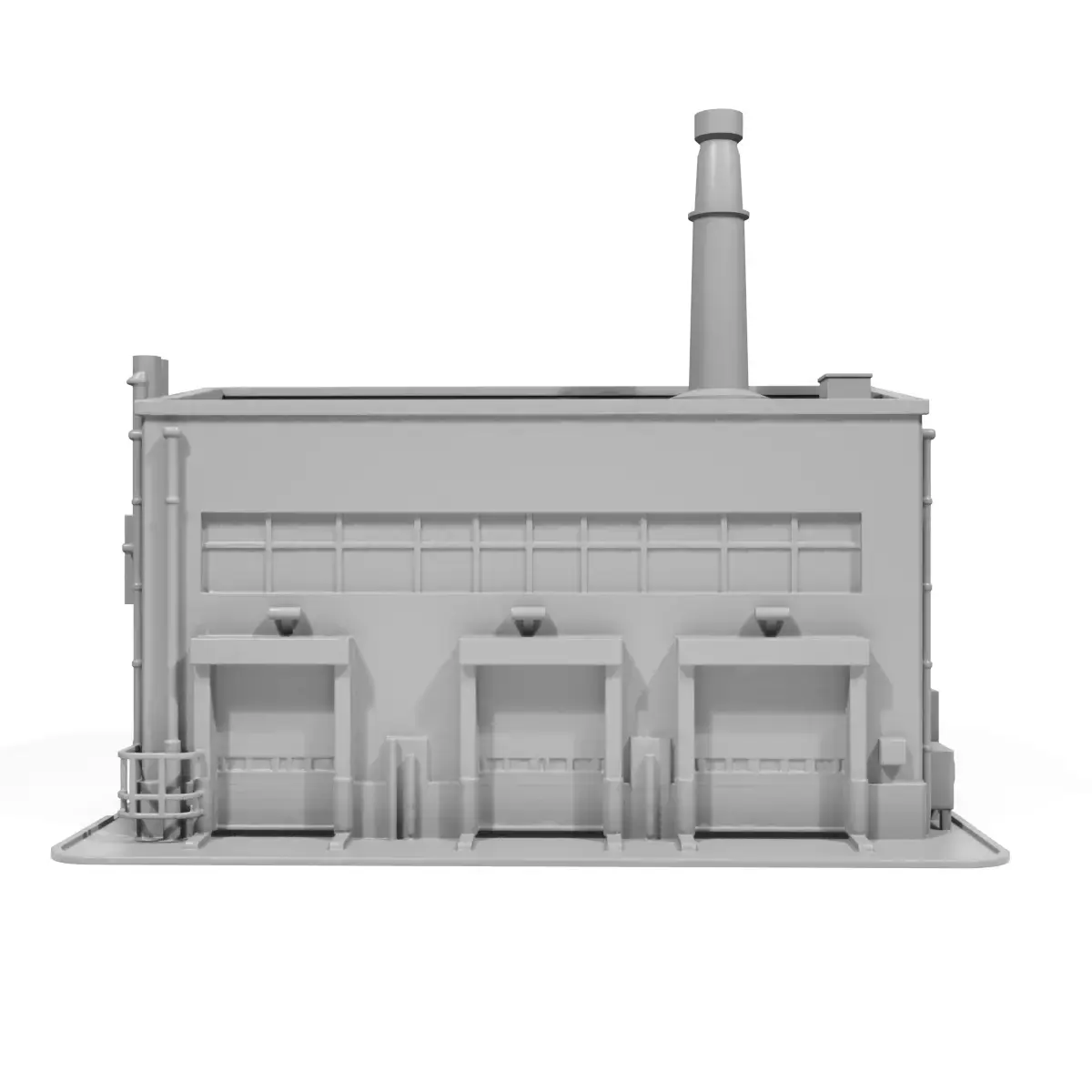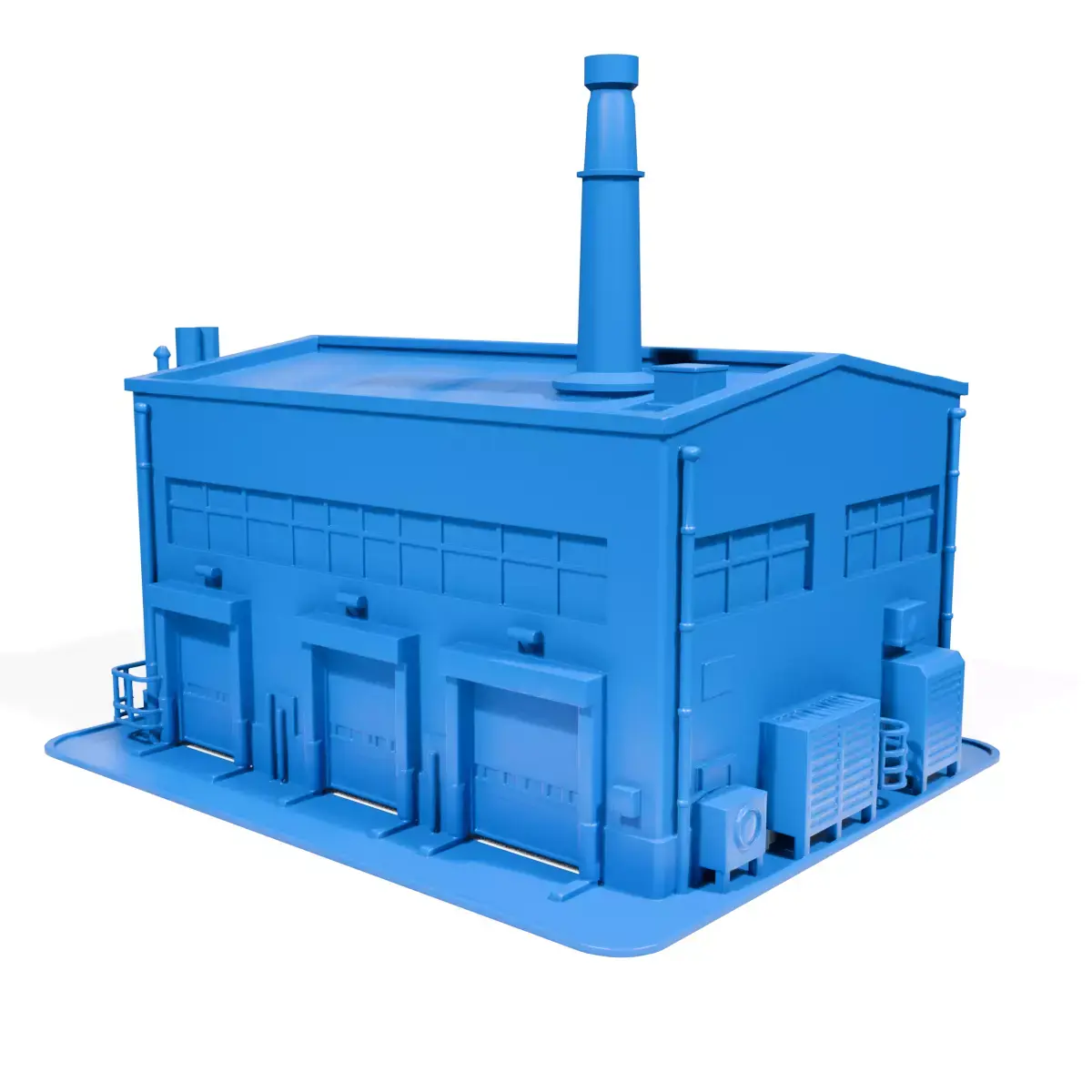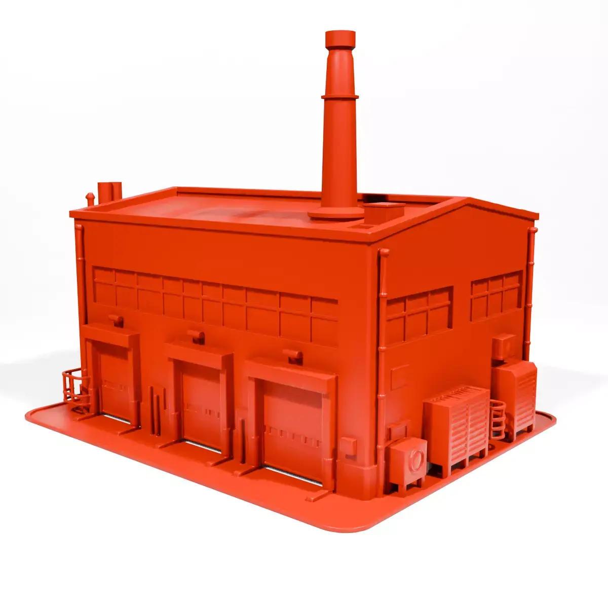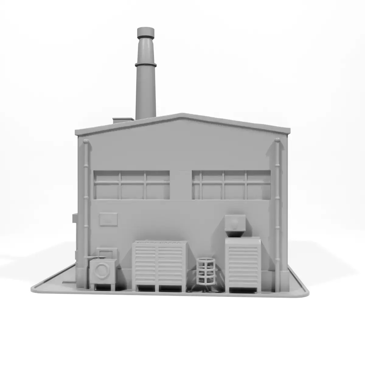 The factory model represents a classic industrial facility, capturing realistic details such as loading docks and rooftop chimneys, making it an ideal piece for a diorama or scale model enthusiast.