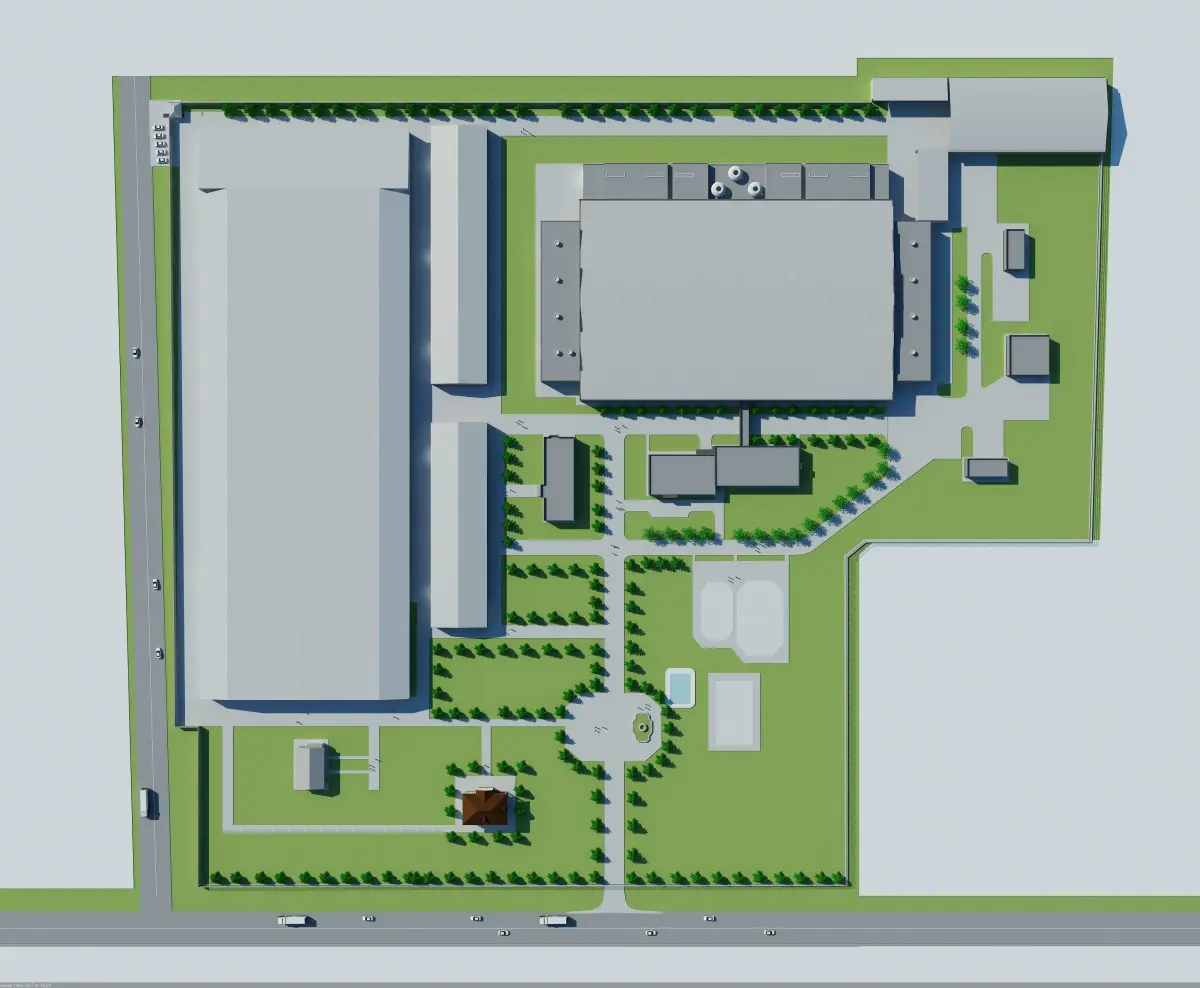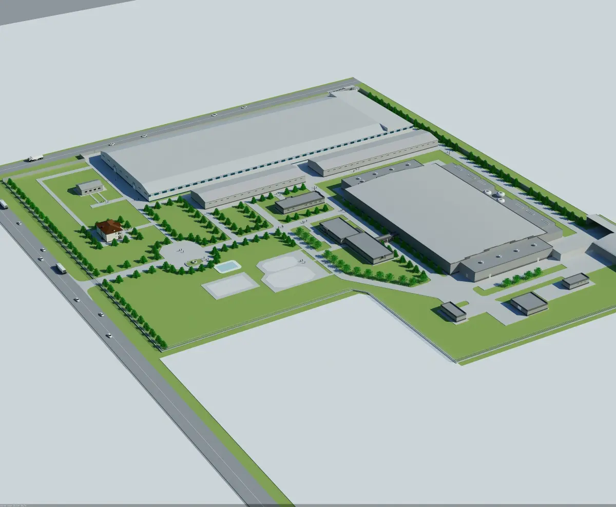 - -Industrial building with parking, office and administrative building- -Industrial building from the architectural design, which can be used for warehouse, factory, production, etc.- -The building has a parking lot, office, administrative facility, loading area.- -All materials in textured formats also have alpha channels, all included.- - Grid of high quality models with clean edge flow.