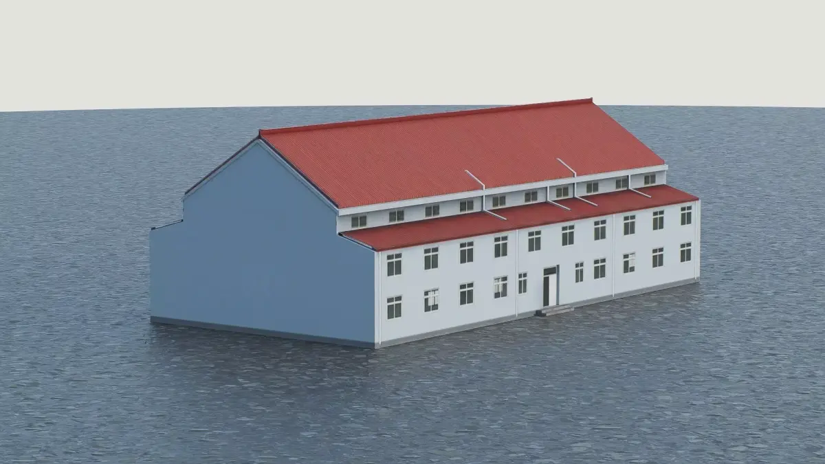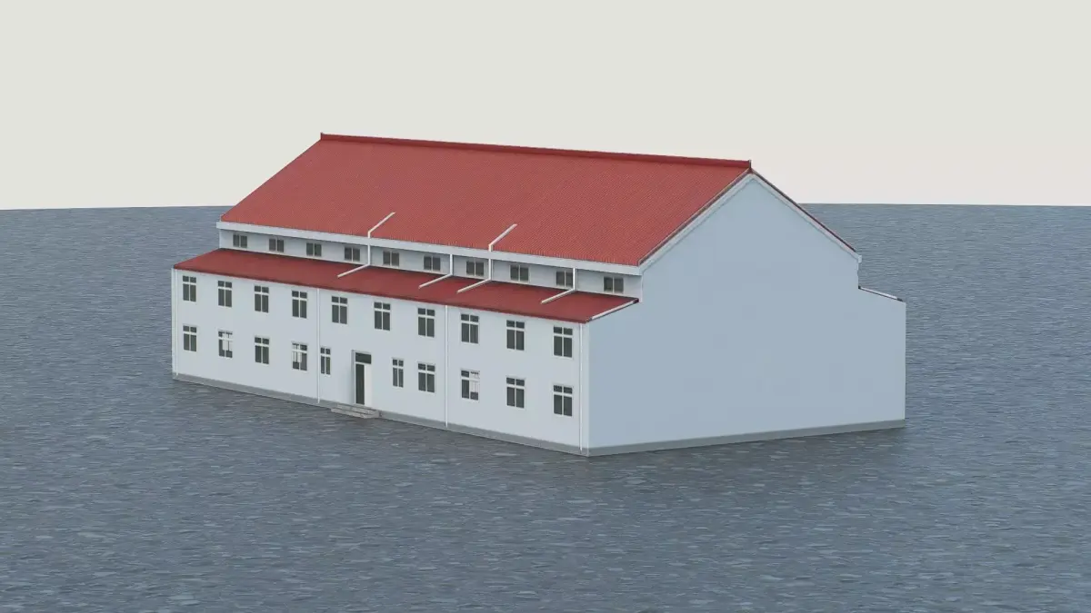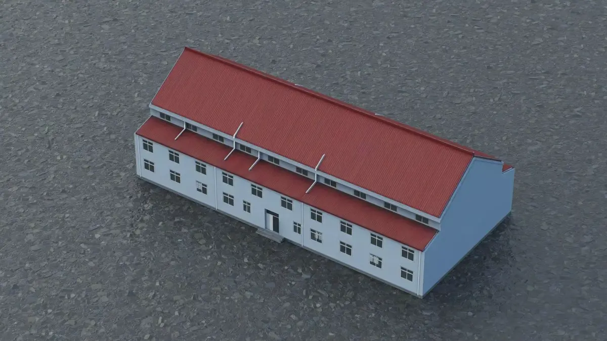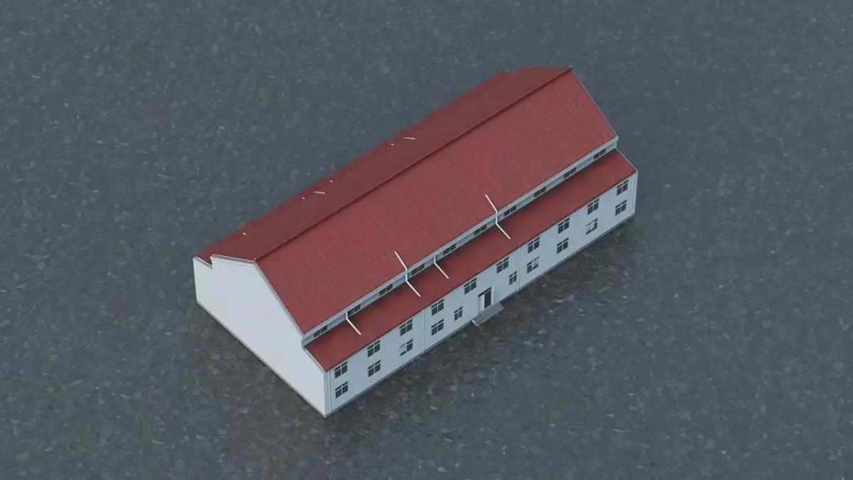 This 3D low-poly model depicts a standard industrial or warehouse structure featuring a classic pitched roof design. The model utilizes a simplified polygonal approach, making it highly optimized for real-time rendering in architectural visualizations, city planning simulations, and game environments. It accurately represents the essential exterior elements, including the distinct red corrugated roofing, symmetrical window placement, and modular facade construction. This asset serves as a versatile component for creating realistic industrial zones or functional commercial districts in digital projects.