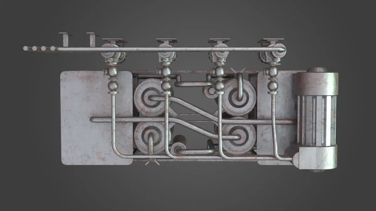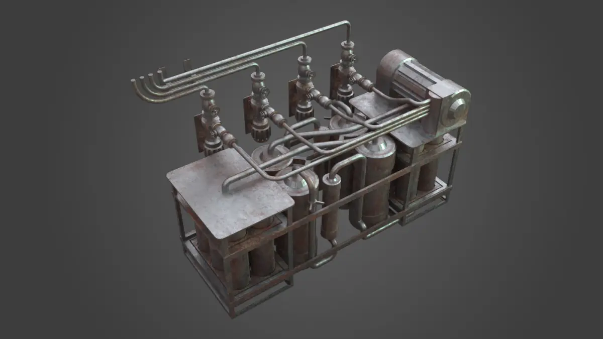 The Gas Exchange element is one element from a collection of elements that all share a small library of shaders (provided). The asset uses multiple UV channels with tiled maps in the shader. Each shader then uses a mask file to provide a unique, non tiled look. The masks are saved into a single PNG file. Each PNG file contains three masks in the R, G, B channels for economical use. Max then uses one of these channels in a Vray Blend shader to influence the tiles.