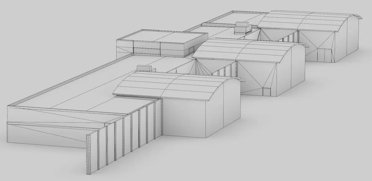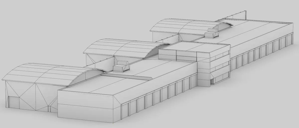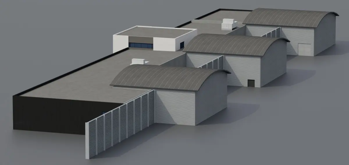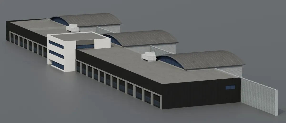 The Factory Garage building is modeled from an actual building situated at the Copenhagen Airport in Denmark. The model is 48 m long, 28,9 m wide and 6,8 m tall.