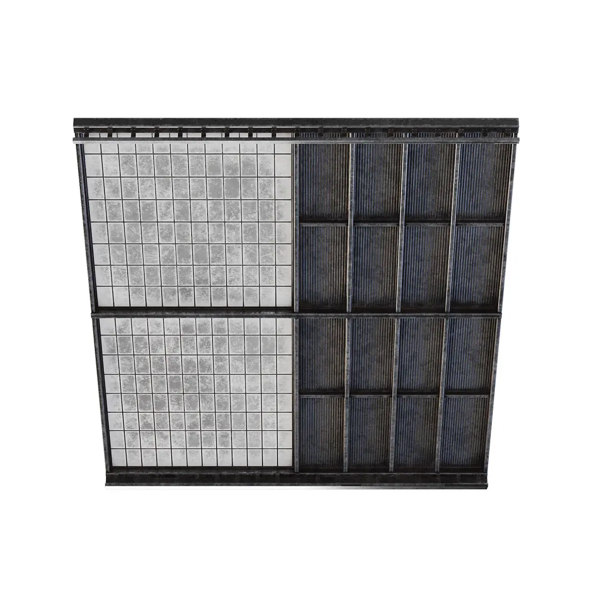 Old factory wide roof with windows and metal panels.