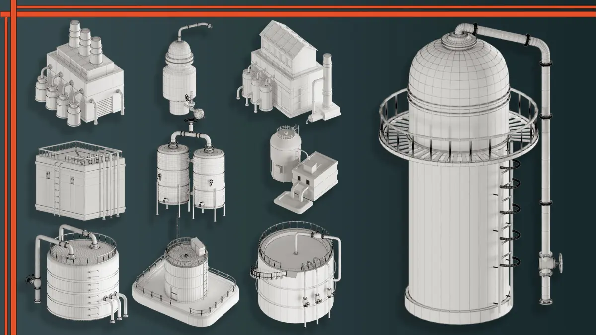 10 pieces factory units include max(2018), blend(3.6) , FBX and OBJ files no UV no texture and asset library.