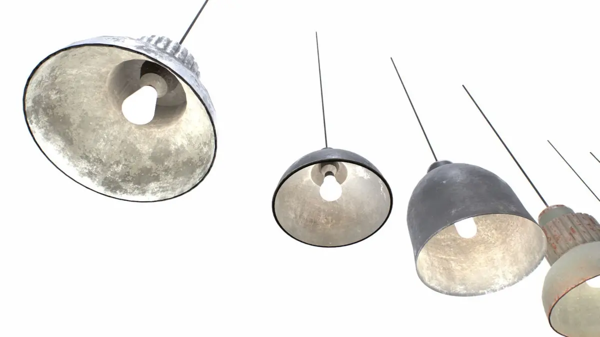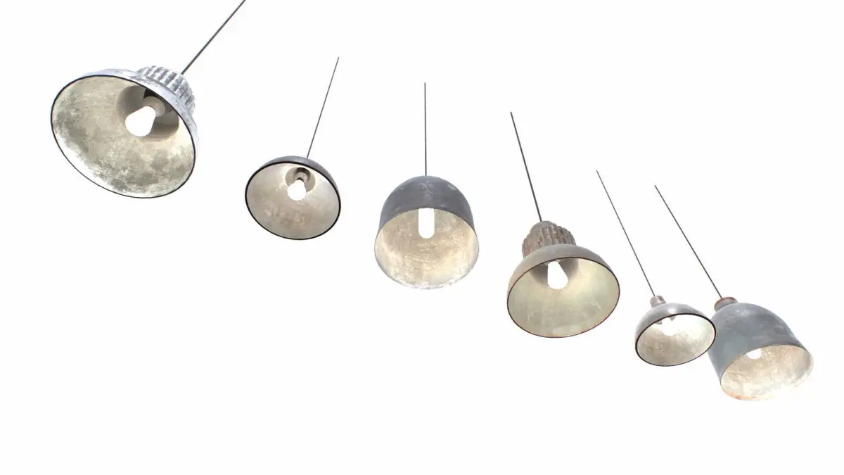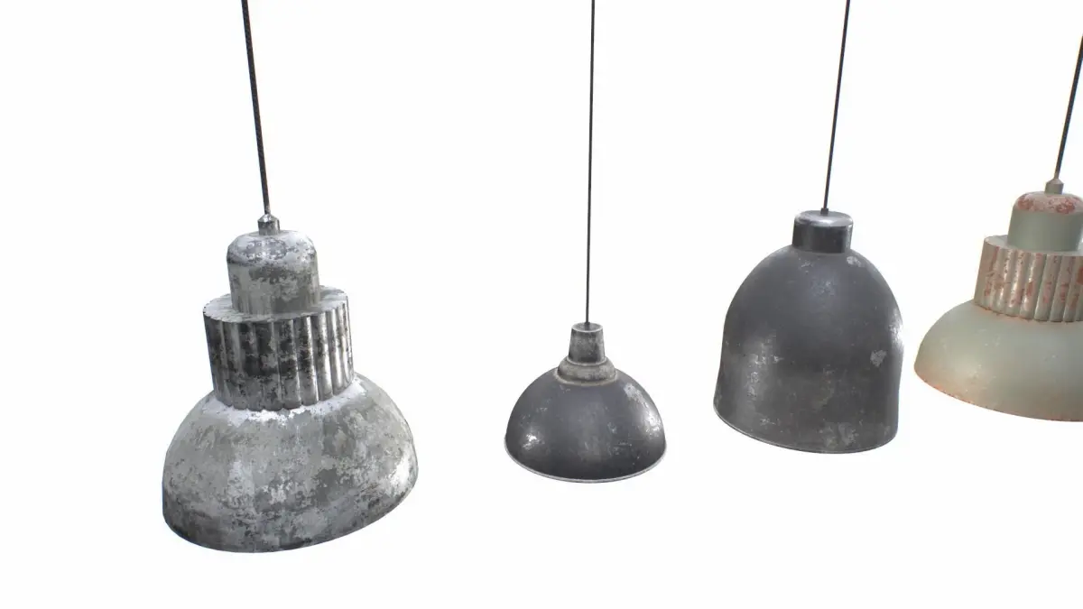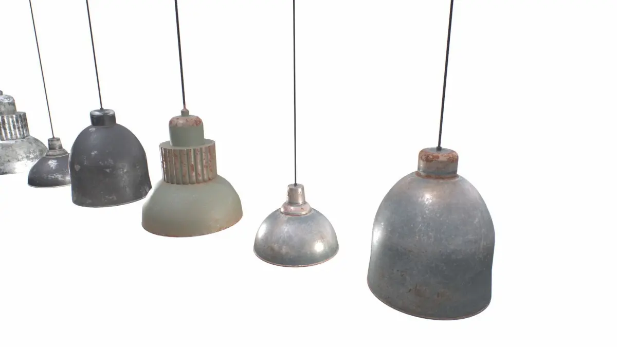 3 industrial lights based in real ones. Pendant lights. Realistic scale. 2 materials in total for the 3 objects, metal and bulb. Metal comes with 2 sets of textures for a total of 6 different objects.