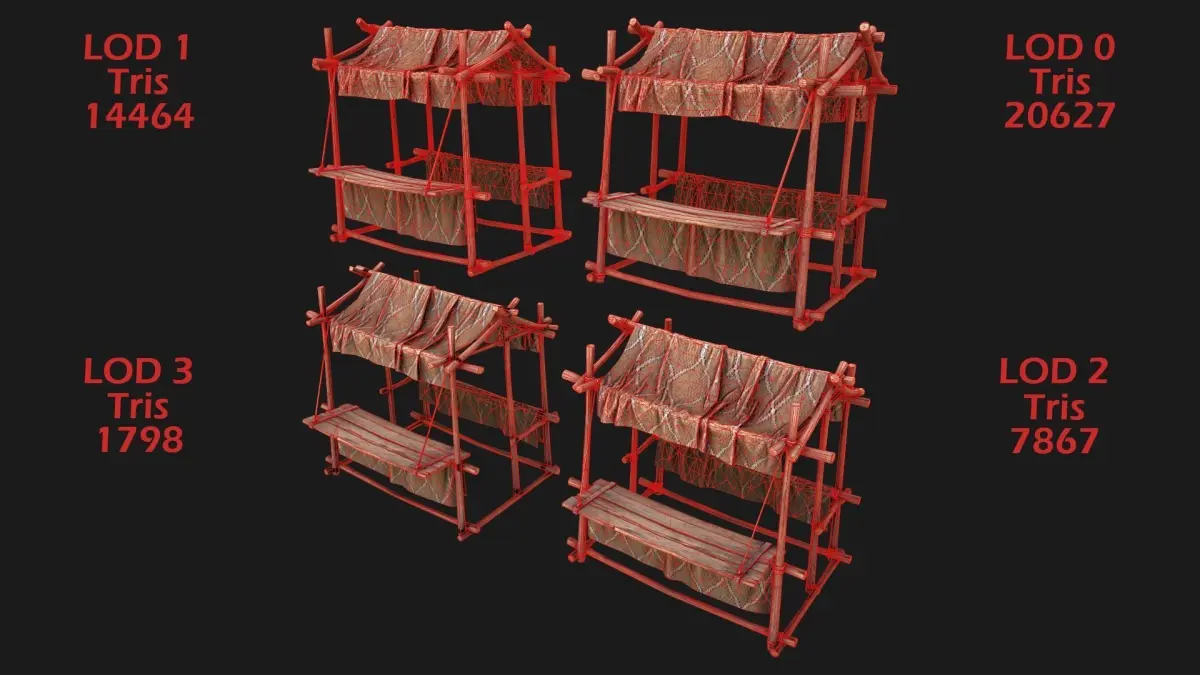 Game ready model. Market Stalls Tent fully textured, sculpted and rendered with Physical based rendering (PBR) - Shown images have been rendered in Marmoset Toolbag .The models contains lods, detailed information on the images.The model consists of two UV Maps :Tent(4096x4096).