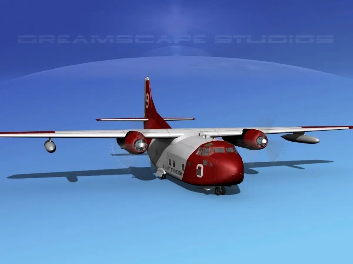 Fairchild C-123B Provider Firefighter 1 This model was originally built in Max 13. It is near to scale (within 3-4% of scale) and fully textured. Materials are in large high resolution formats. The model has a lot of detail on the exterior of the aircraft. There are many animateable features including the ailerons, flaps, elevators, rudder, and landing gear retraction as well as landing gear doors can be closed. The rear access ramp may also be opened. Propellers are animated at idle rpm. This model was designed for visualization use and can be used animated or not in scenes flying of sitting on ramp or tarmac. These models are realistic and sever military and civil liveries are available. Several various formats are available.