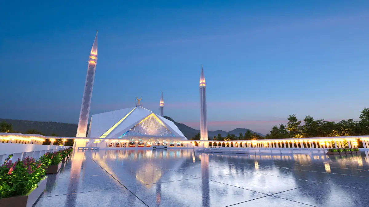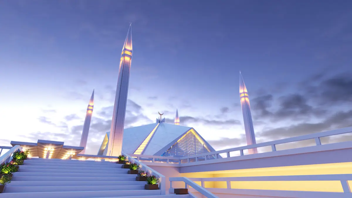 It is the 3D model of Faisal Mosque, Islamabad, Pakistan.This mosque contains mountains, 4 mirates and one external design written history on this external design in urdu and english.