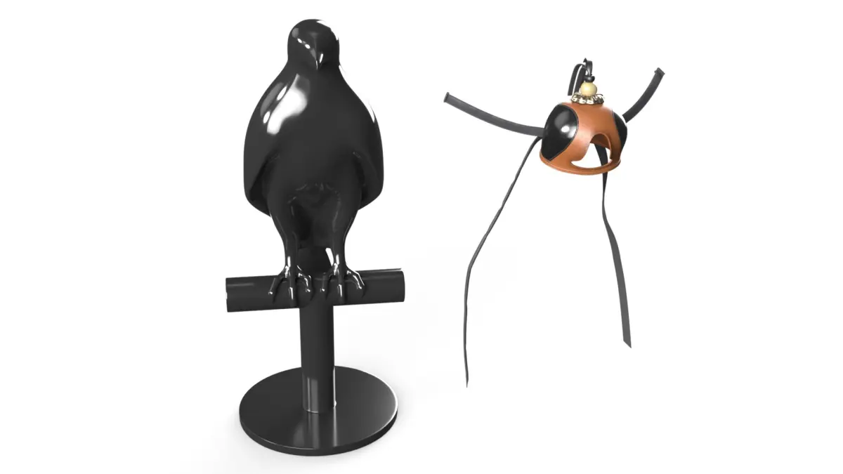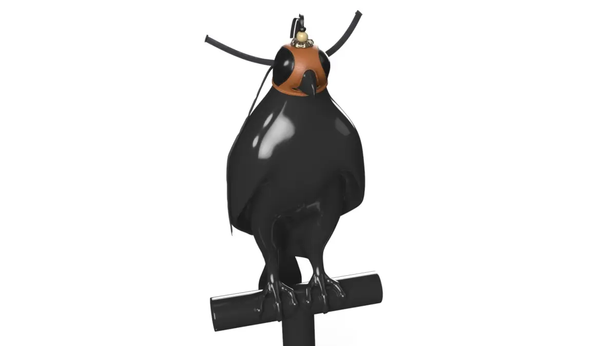 Falcon Dummy with Leather Hood is a three-dimensional model of falcon mannequin outfitted with a traditional leather falconry hood, designed to resemble a trained hunting bird used in falconry practice.