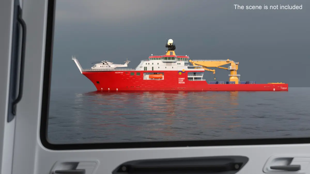 Falkor Too Research Vessel with Transport Helicopter is a 3d model of research vessel operated by the Schmidt Ocean Institute, designed to support scientific exploration and marine research.