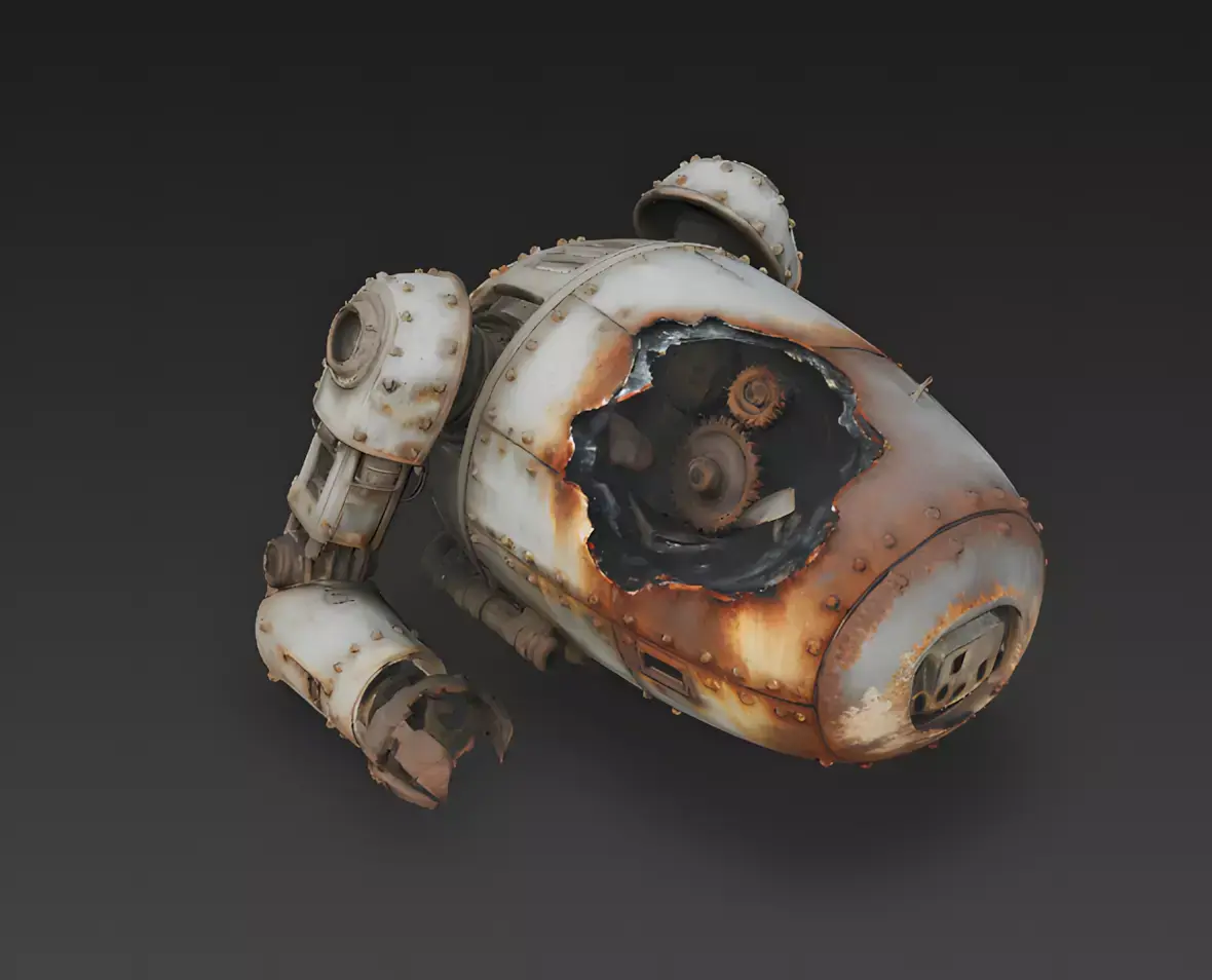 The Overall Concept This asset depicts the final resting place of a steam-powered automaton. Lying on its side and heavily corroded, it serves as a perfect environmental prop for a scrapyard level, a battlefield aftermath, or a ruined civilization biome. It adds narrative history to a scene without requiring animation.
