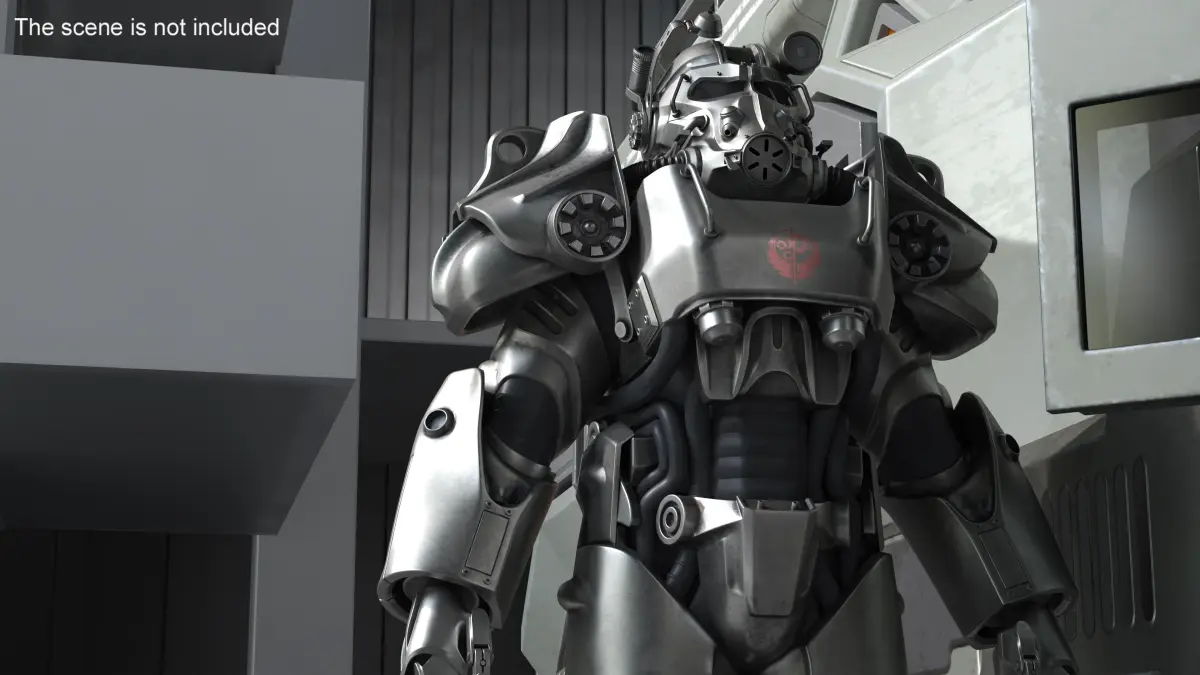 This model is meticulously crafted to showcase the robust design of the T-60 power armor, featuring intricate details such as articulated joints, battle-worn textures, and integrated weapon systems. It captures the essence of post-apocalyptic combat gear with its imposing stature and functional weaponry.
