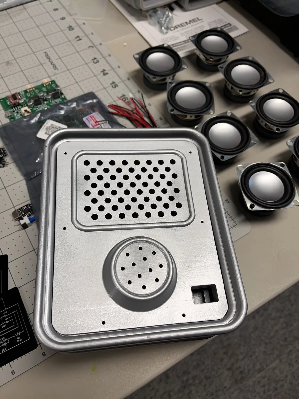 The main body has framing to hold the speaker lid and improve sound quality. It has three vents to reduce suction and improve print quality will printing flat to the bed. It has USB-C port slot and indicator light holes.The speaker lid is designed to hold 2-53mm diameter speakers.The main lid has supports built in until the microphone area so it can be printed flat to the bed. It also has opening for the single button and six M3 phillips screws hole opening.