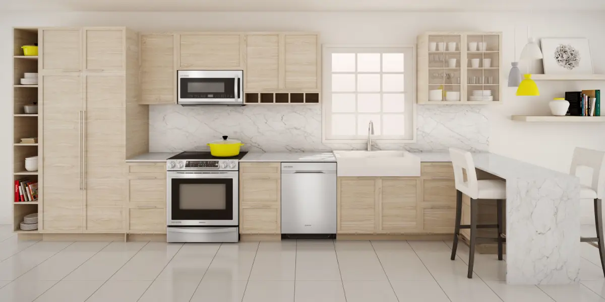 Samsung appliances, plates,glasses,books, cooking pots, vases, picture frame, bar stool chairs, lighting fixtures etc.