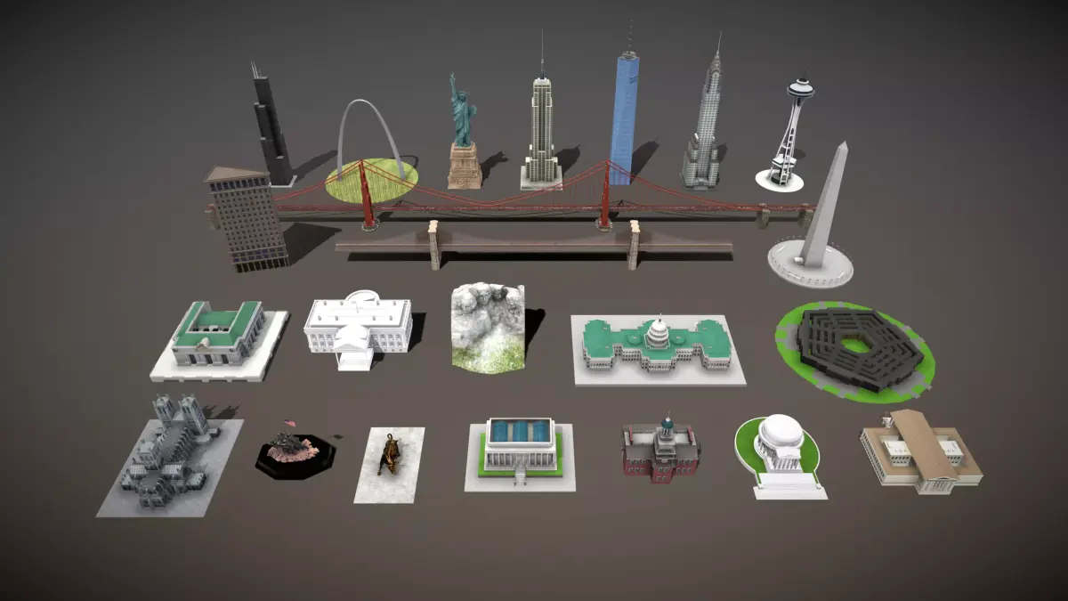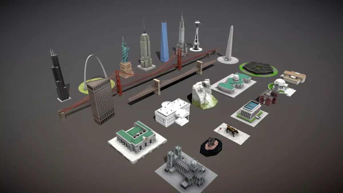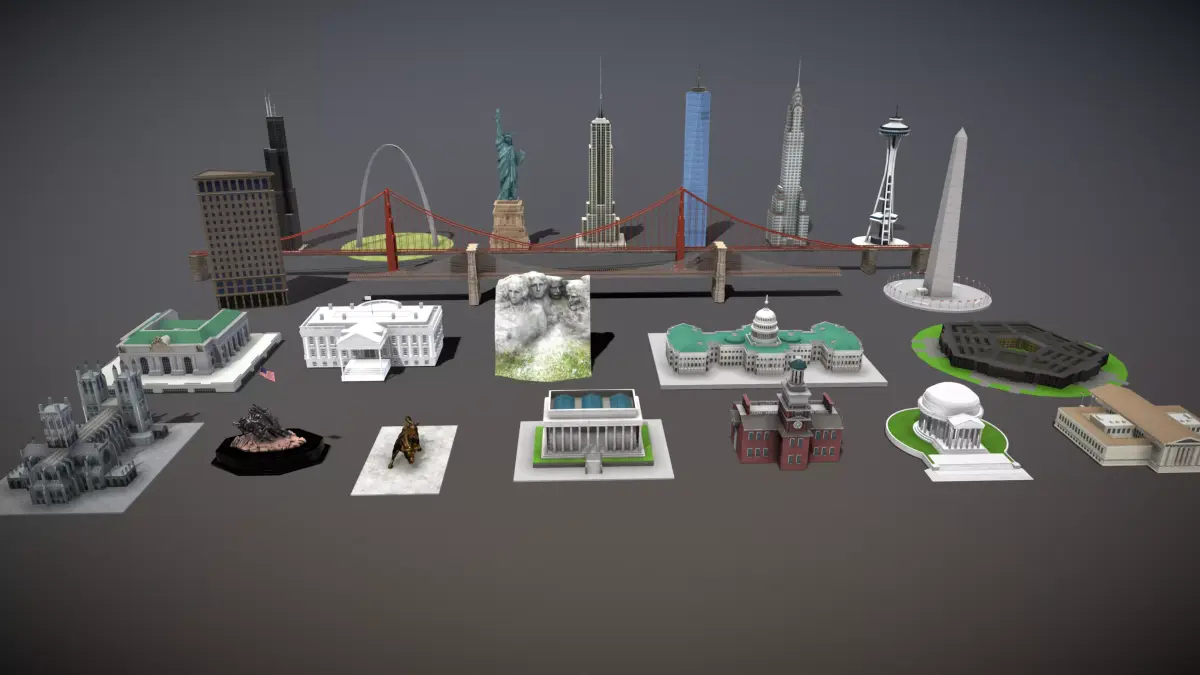 Famous Buildings in the United States – Collection. This includes 3D models of the Empire State Building, the White House, Charging Bull, United States Capitol, Brooklyn Bridge, Chrysler Building, Lincoln Memorial, Willis Tower, Independence Hall, Space Needle, The Pentagon, Thomas Jefferson Memorial, Washington National Cathedral, Supreme Court of the United States, Grand Central Terminal, Gateway Arch, Mount Rushmore National Memorial, Marine Corps War Memorial, The Statue Of Liberty, Golden Gate Bridge, Washington Monument, Flatiron Building, One World Trade Center.
