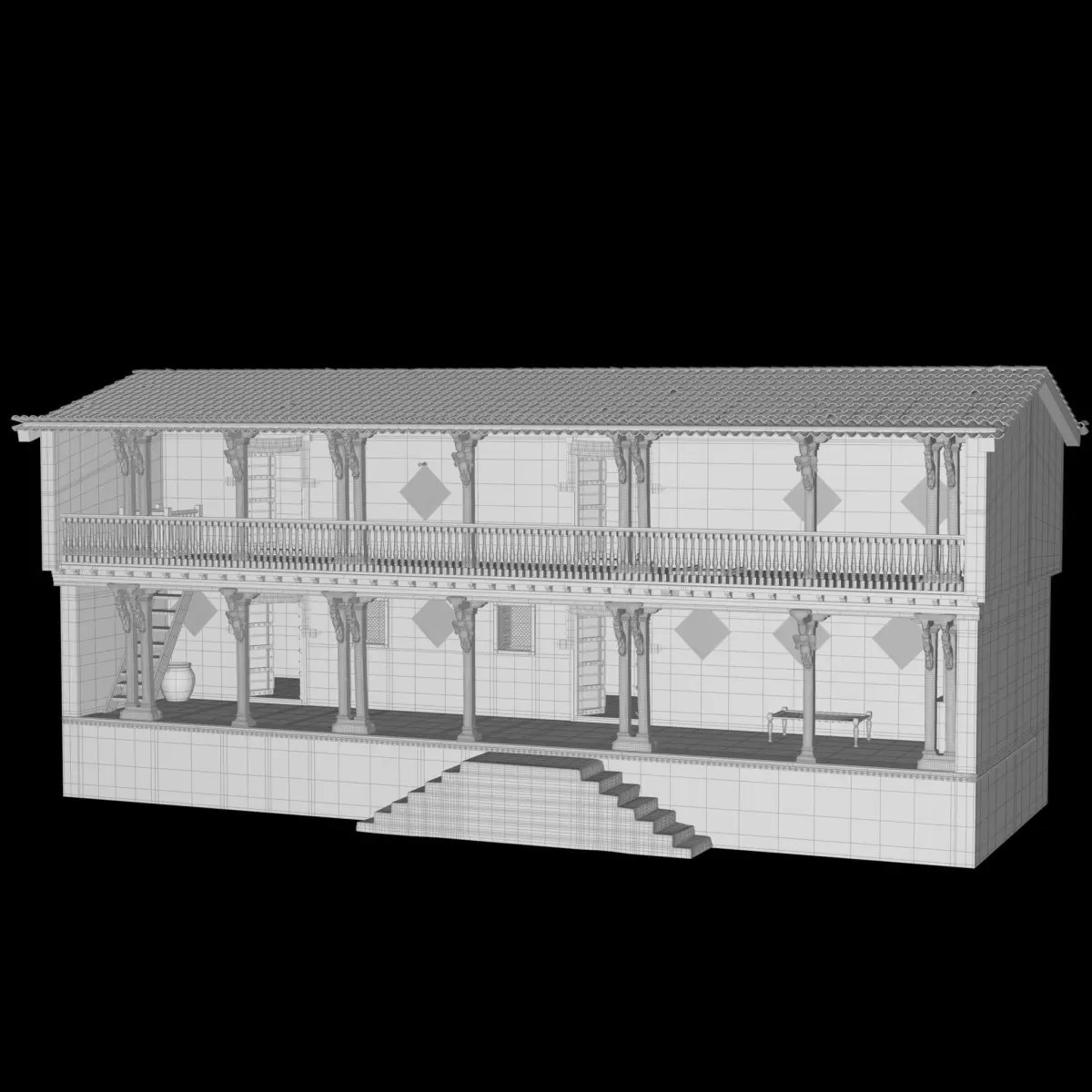 This model has many detailed carvings in the columns of the house. Also in the stone footings of the house.