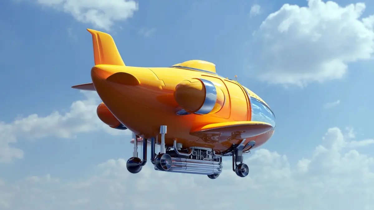 Airplane / airship in the style of retrofuturism or dieselpunk. Looks a bit like the submarine from the Beatles video, but it's actually orange. Guys, don't ask me how it can take off, I don't know :D Its just flight of imagination
