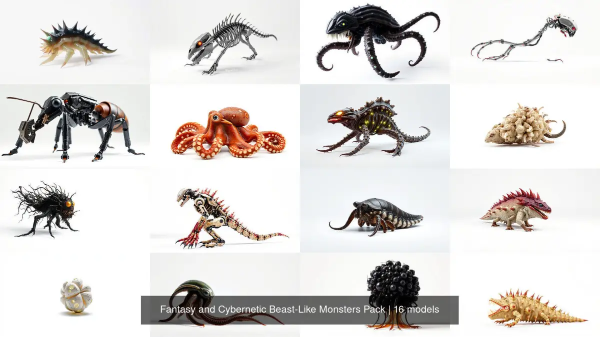 This pack features 16 high-quality 3D models of fantasy beast-like monsters, mythical creatures, and cybernetic abominations. The collection includes both organic and mechanical beings, blending wild, untamed designs with advanced cybernetic enhancements and biomechanical details.