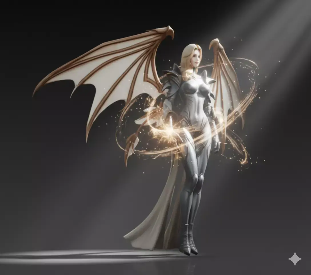 She is clad in sleek, form-fitting armor made of polished silver and dark metal, with intricate detailing on the shoulders, chest, and thighs that suggest advanced craftsmanship and divine origin. Large, translucent wings extend from her back—resembling those of an angel or dragon—with delicate veins and a subtle gradient from white to deep brown, giving them a lifelike, almost organic quality. The wings are slightly spread, as if she is preparing for flight or battle.