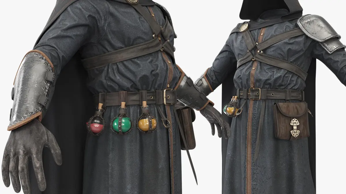 Set of fantasy style, medieval themed clothes set which depicts a battle magician-assassin outfit. This detailed model represents a complete attire combining both mystical and stealth design elements, featuring a hooded cloak, pants, shirt, shoulder armor, bracers, boots, and a leather belt with potion vials.