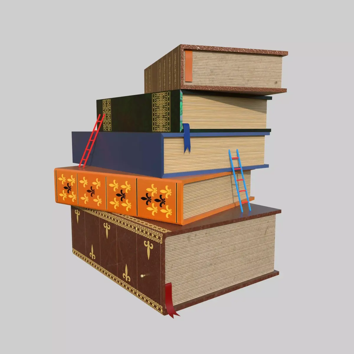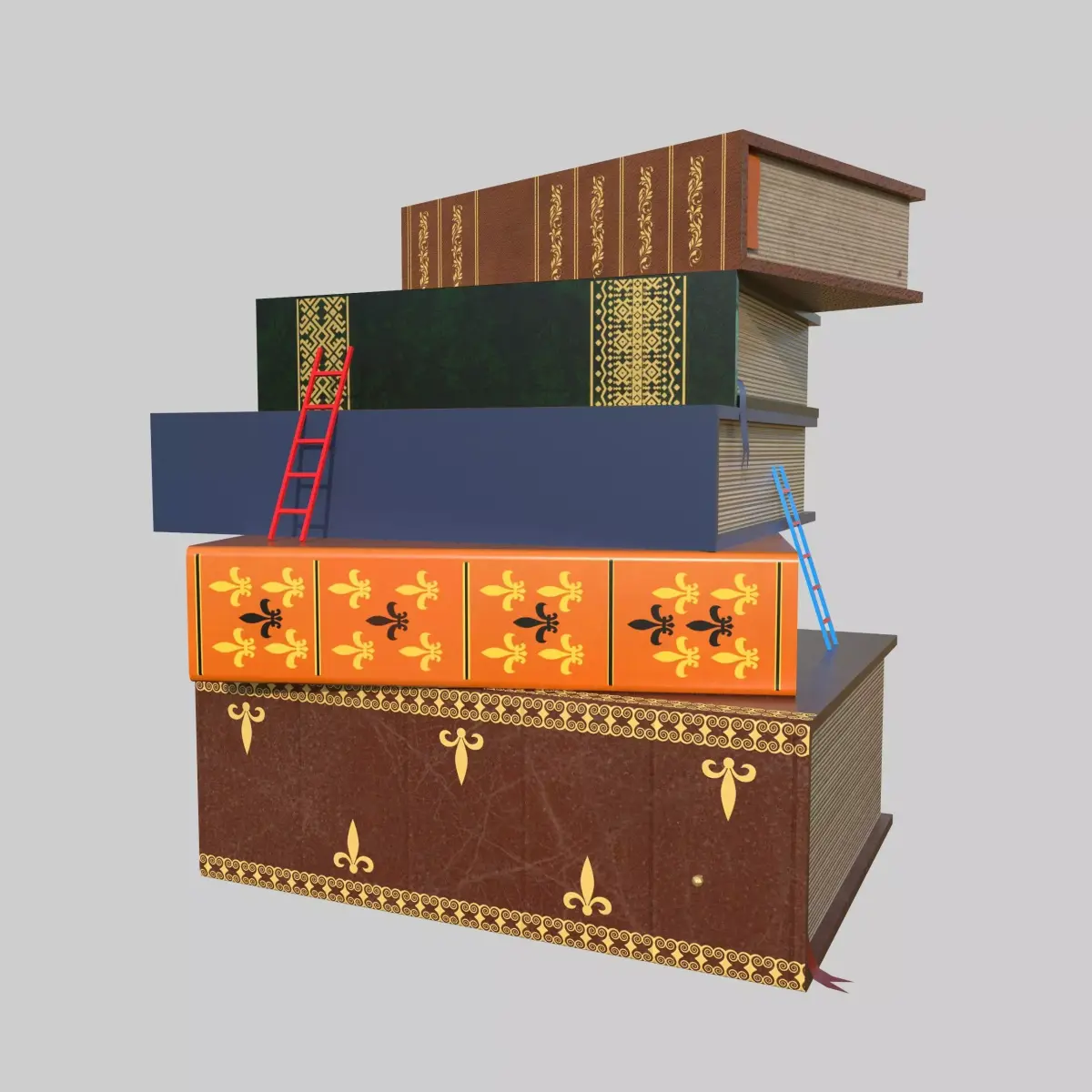 A beautifully stylized Book Stall model featuring an artistic stack of oversized books arranged in a fantasy-themed display. Each book includes textured covers, gold patterns, bookmarks, and miniature decorative ladders that enhance the whimsical look.