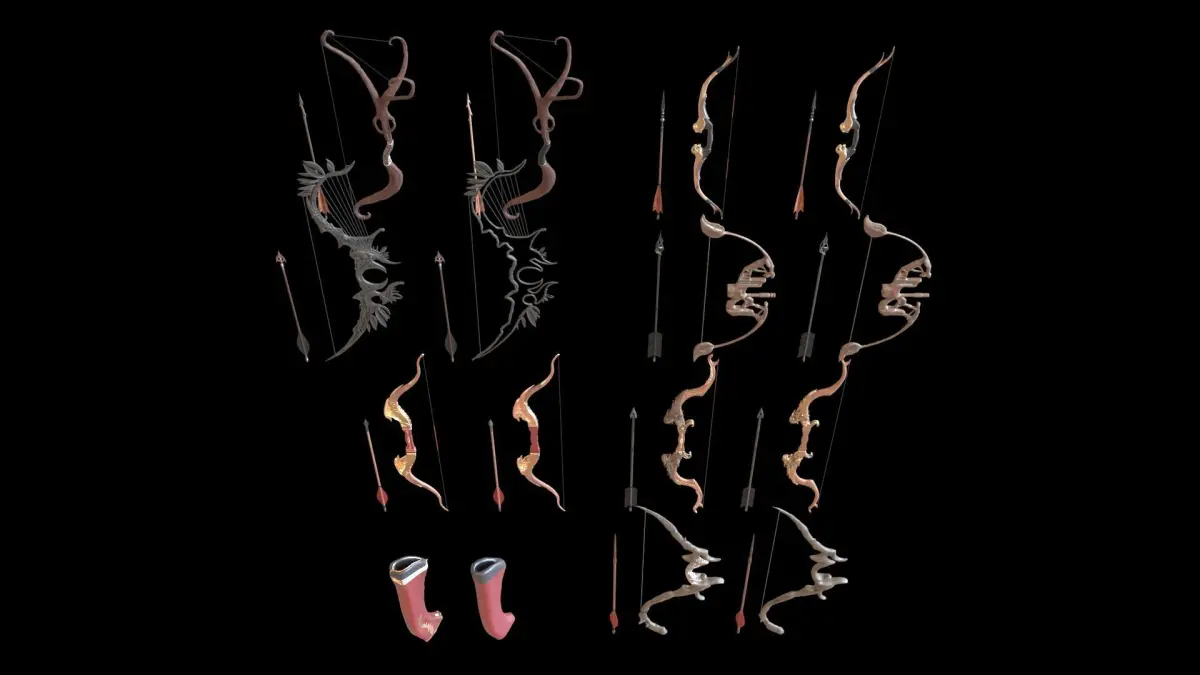 This fantasy-themed bow and arrow 3D asset pack includes a diverse collection of uniquely designed bows and matching arrows, perfect for RPGs, adventure games, cinematics, or fantasy art. Each weapon showcases distinct stylistic traits—from dragon-inspired curves to sleek elven contours—making this set ideal for both hero characters and enemy classes.