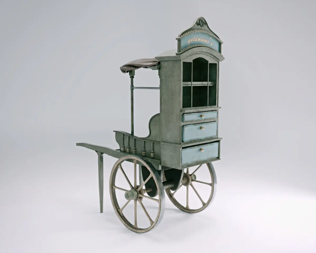 Fantasy themed merchandise cart - fantasy prop 3D model. It's based on a concept I found on pinterest, but it's modified. Both proportions and details. Software used - 3dsmax, Marvelous designer, Substance Painter. Preview images are mostly done using Corona rendered and Iray (Substance Painter previews)