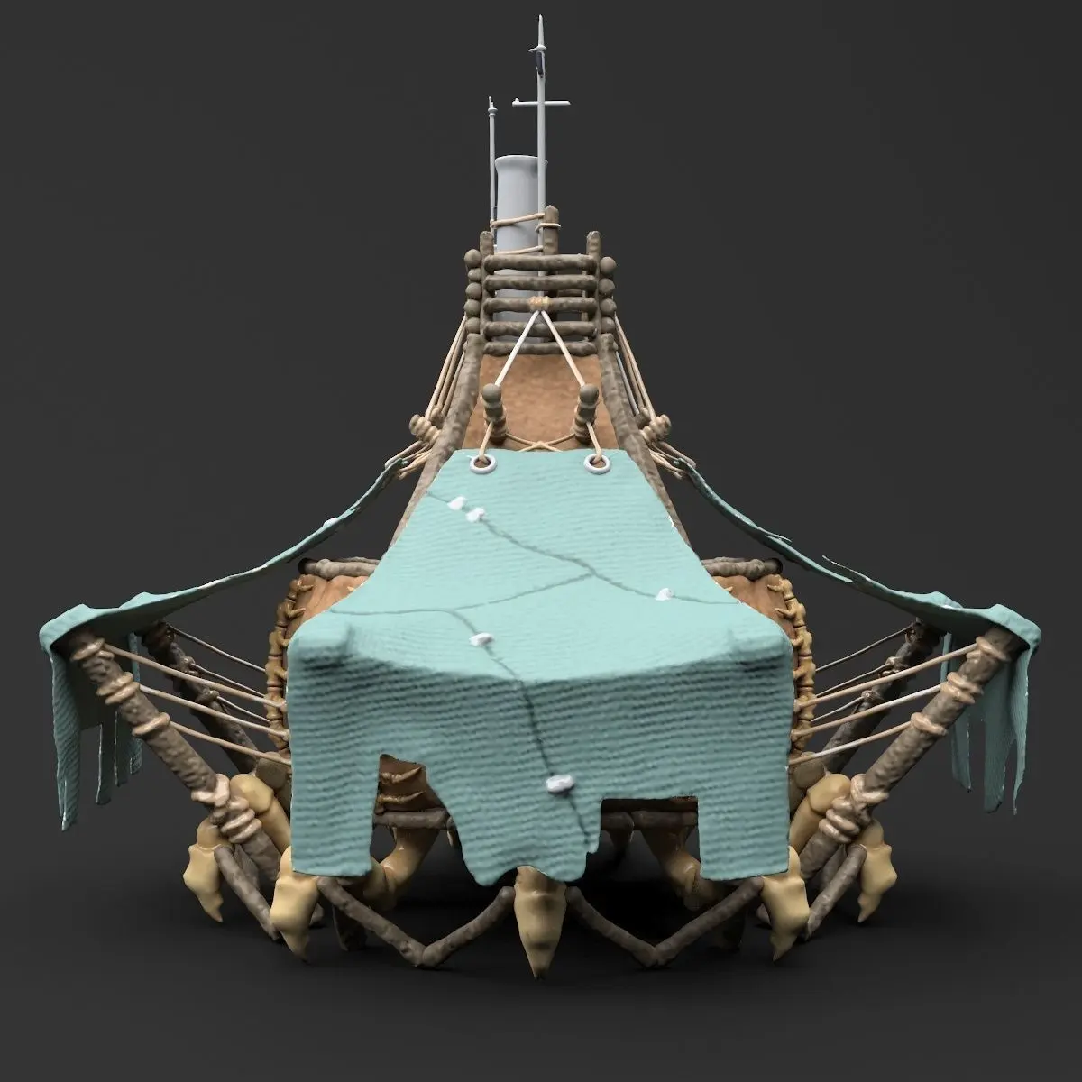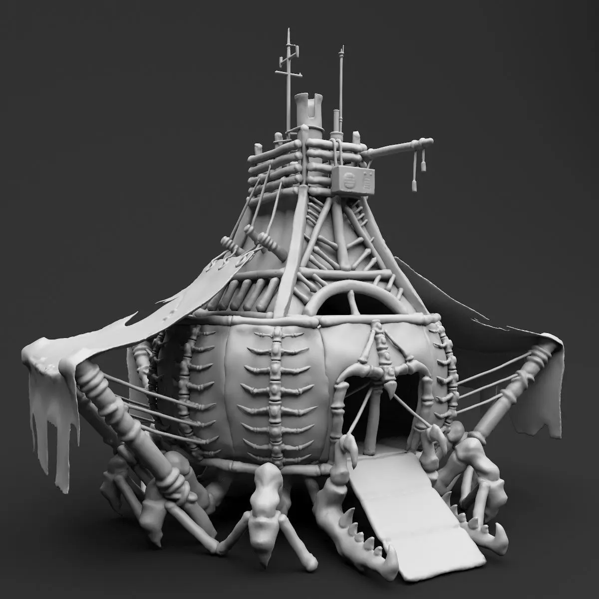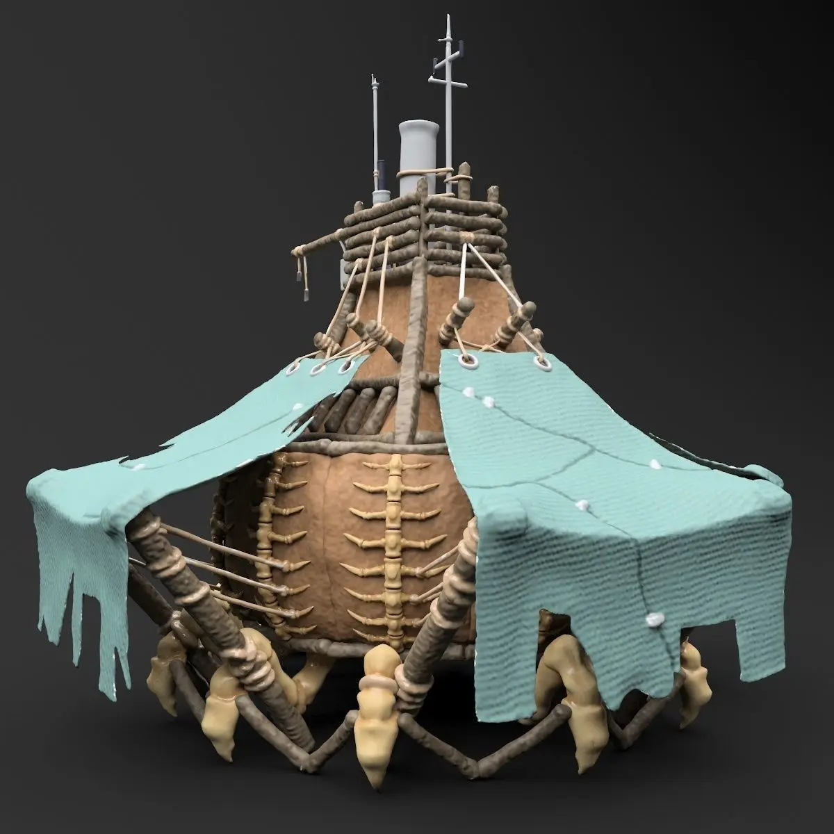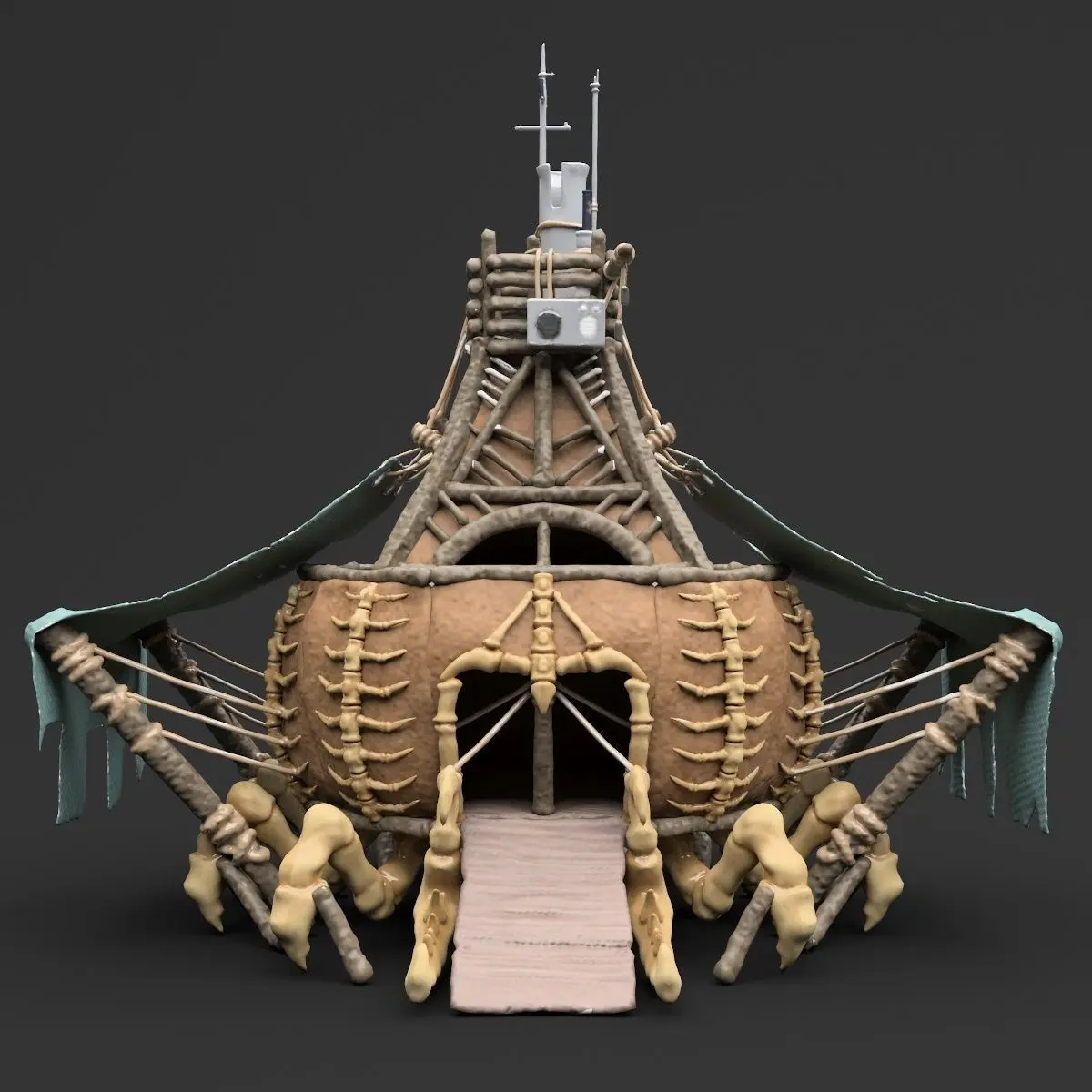 A fantasy crab-like house made of wood, bone and leather.