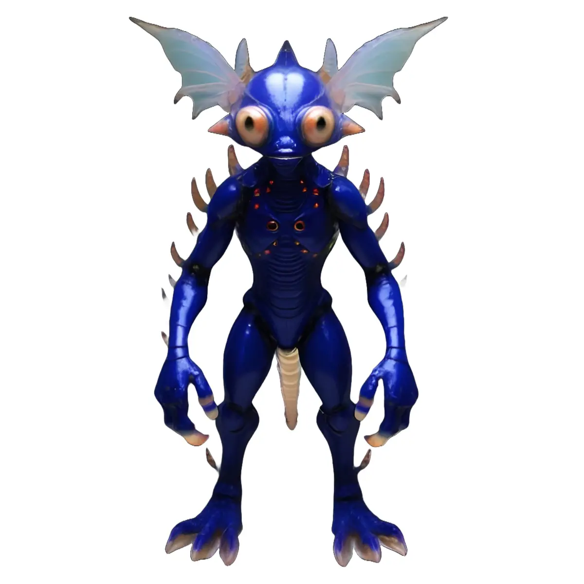- Aqua Warrior - A striking deep blue creature with wing-like appendages and distinctive eyes. The design includes intricate scales and armor-like plating with translucent wing elements.