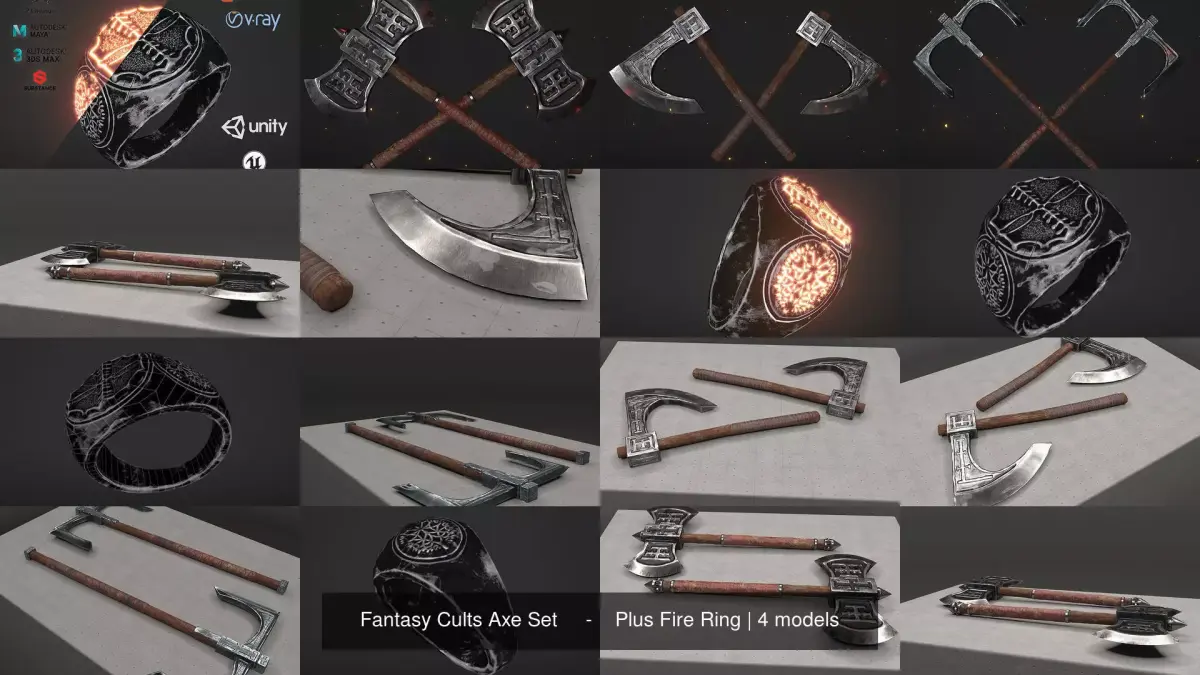 This is a set of 3 high detailed axe which I have designed myself their them is a fantasy cult but you can use it however you want. Plus a bonus Fire Ring.