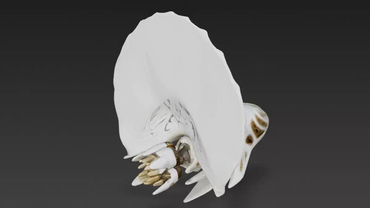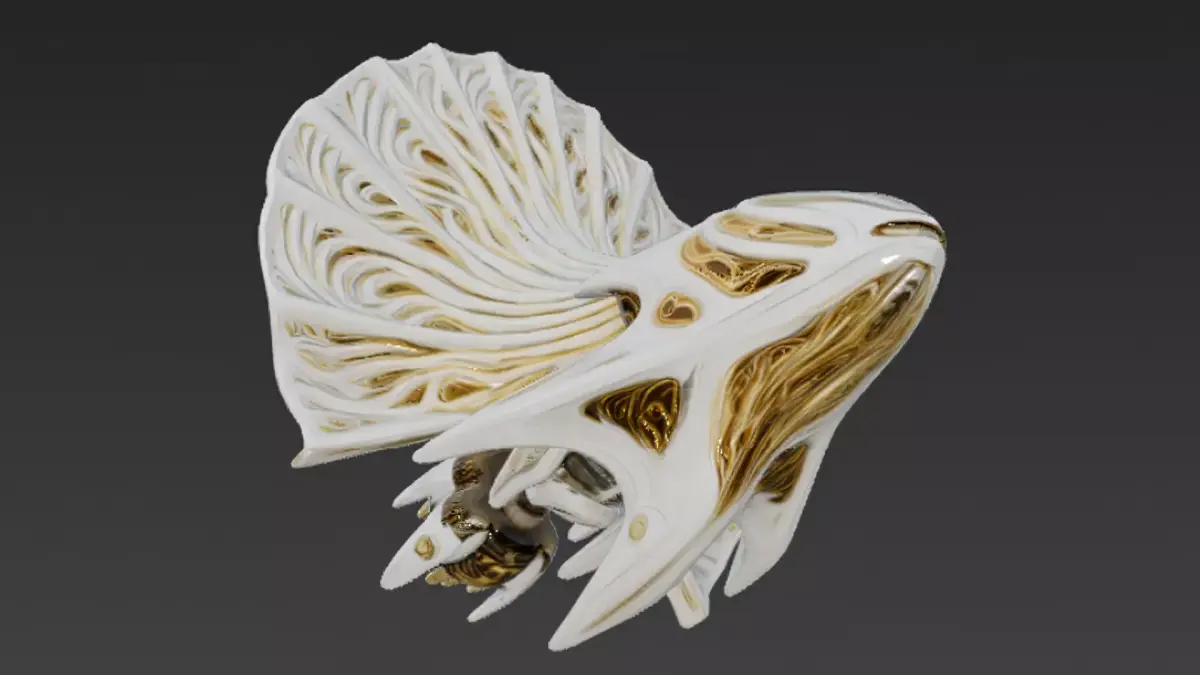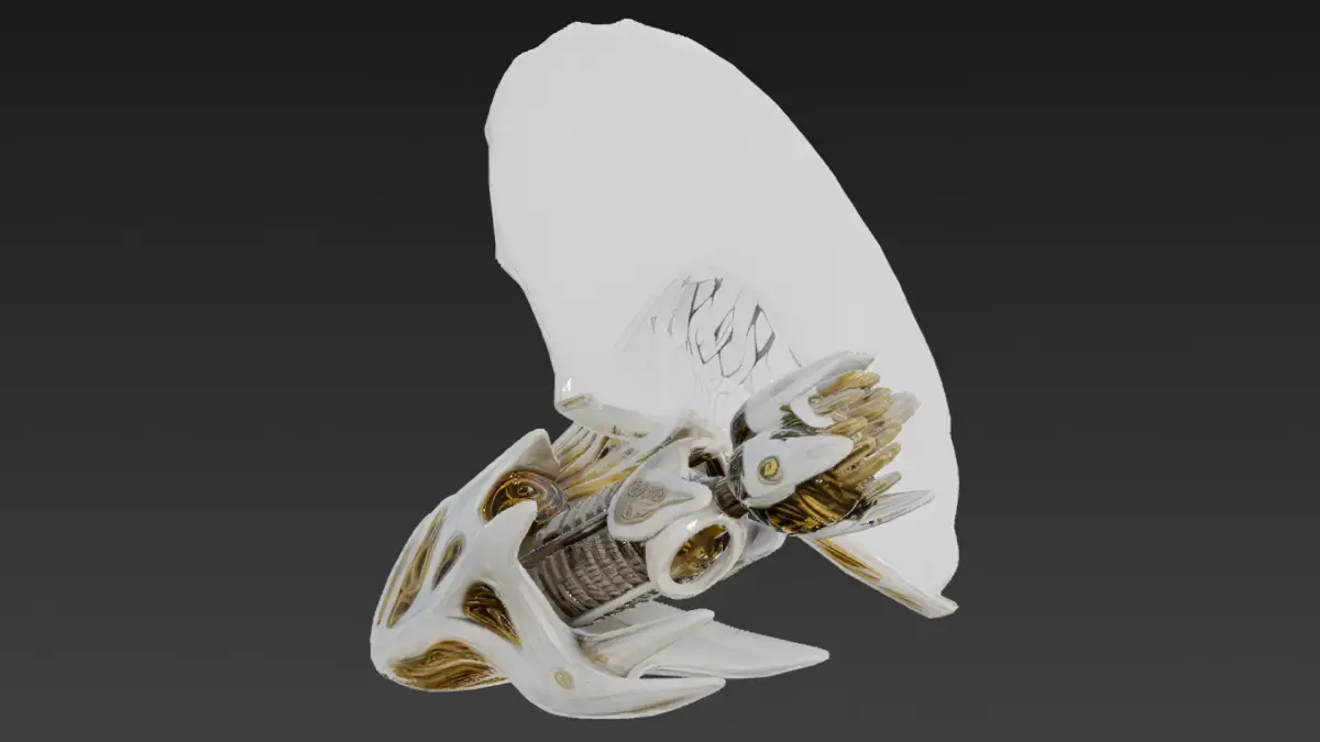This 3D model blends the elegance of a fish-like mythical being with advanced cybernetic elements, featuring a striking white body accented with refined gold details to create a luxurious and futuristic fantasy presence.