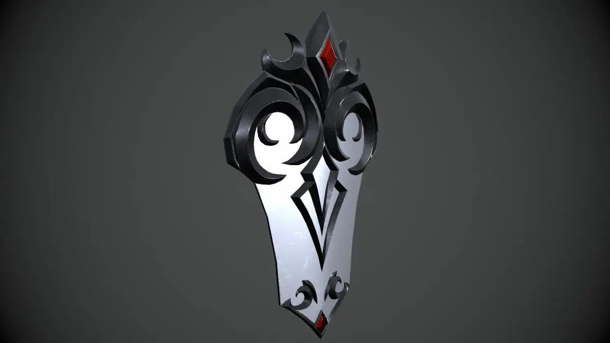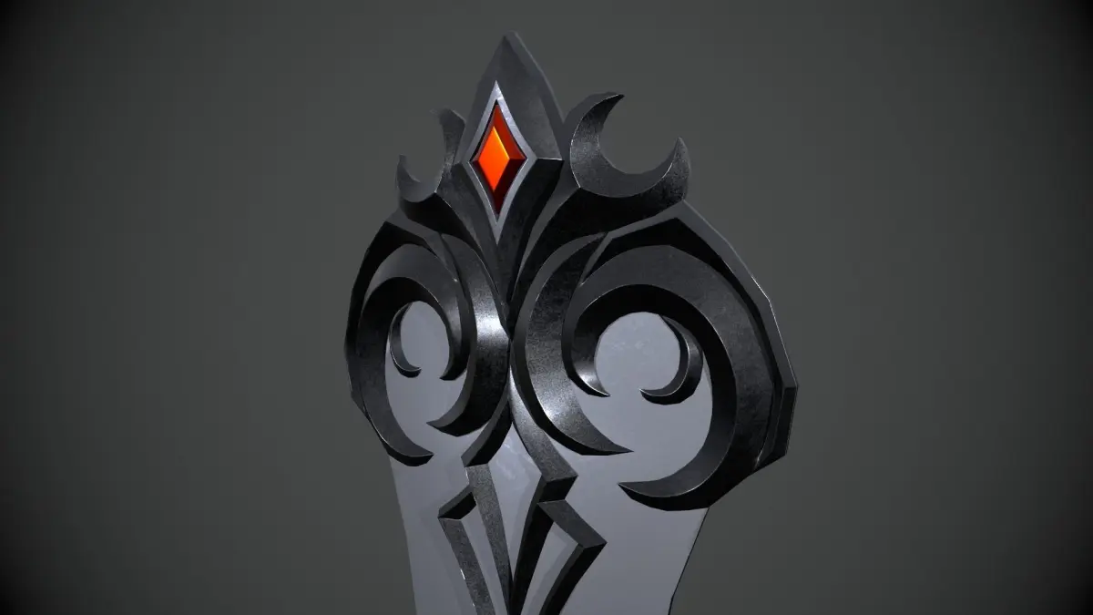 This is a model of a realistic fantasy dark shield with inlaid red stone.