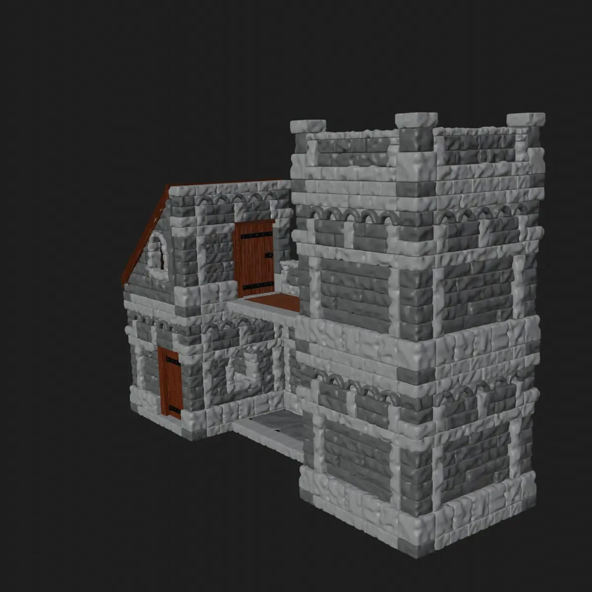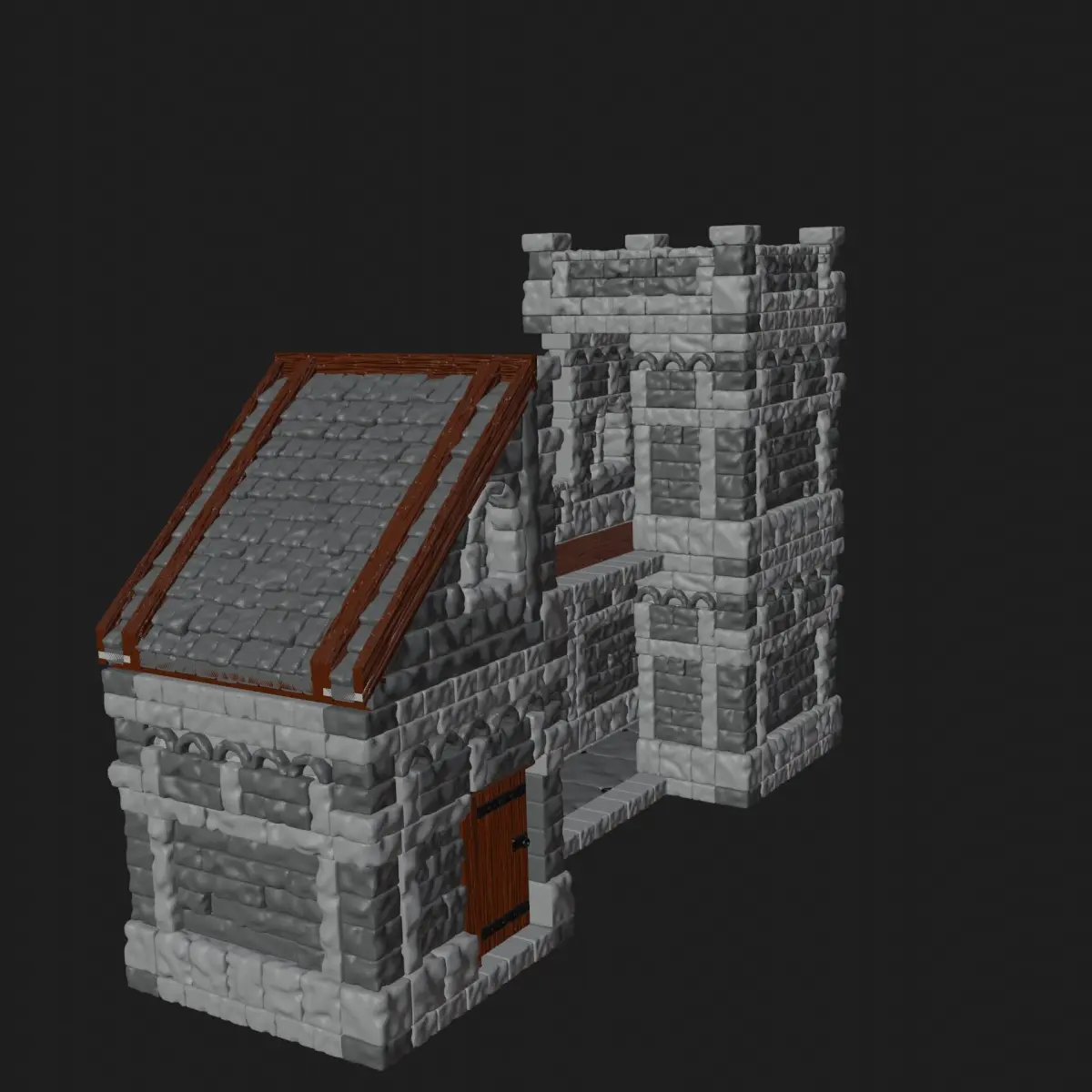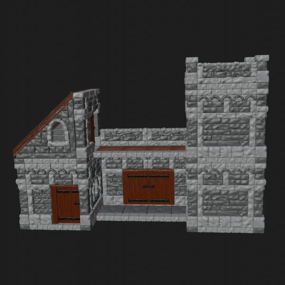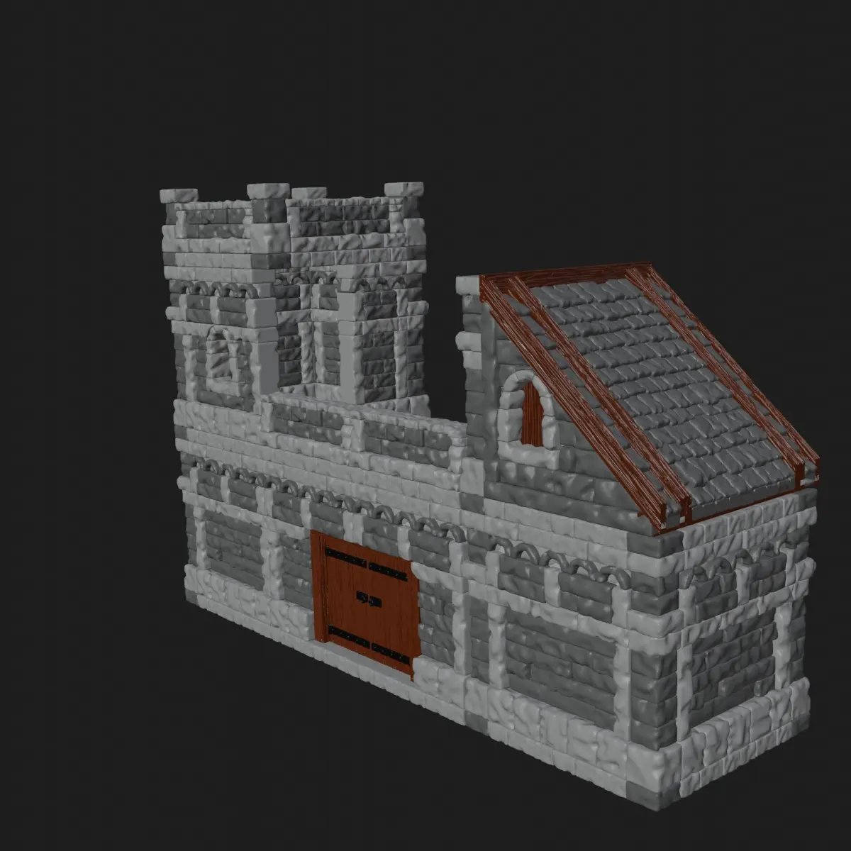 - entrance: a wooden door as a gate, whit a small tower on one side and a small house on the other. (note: if the slicer allow it, it is possible to mirror one set of the files and build an entrance with towers or houses on each side)